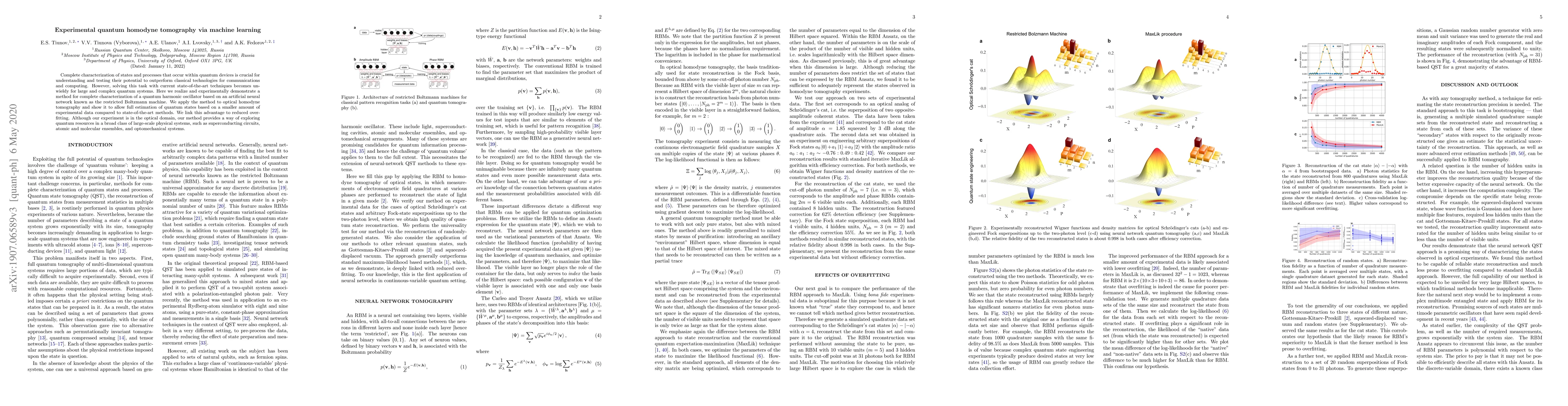 Complete characterization of states and processes that occur within quantum devices is crucial for understanding and testing their potential to outperform classical technologies for communications and computing. However, solving this task with current state-of-the-art techniques becomes unwieldy for large and complex quantum systems. Here we realize and experimentally demonstrate a method for complete characterization of a quantum harmonic oscillator based on an artificial neural network known as the restricted Boltzmann machine. We apply the method to optical homodyne tomography and show it to allow full estimation of quantum states based on a smaller amount of experimental data compared to state-of-the-art methods. We link this advantage to reduced overfitting. Although our experiment is in the optical domain, our method provides a way of exploring quantum resources in a broad class of large-scale physical systems, such as superconducting circuits, atomic and molecular ensembles, and optomechanical systems.