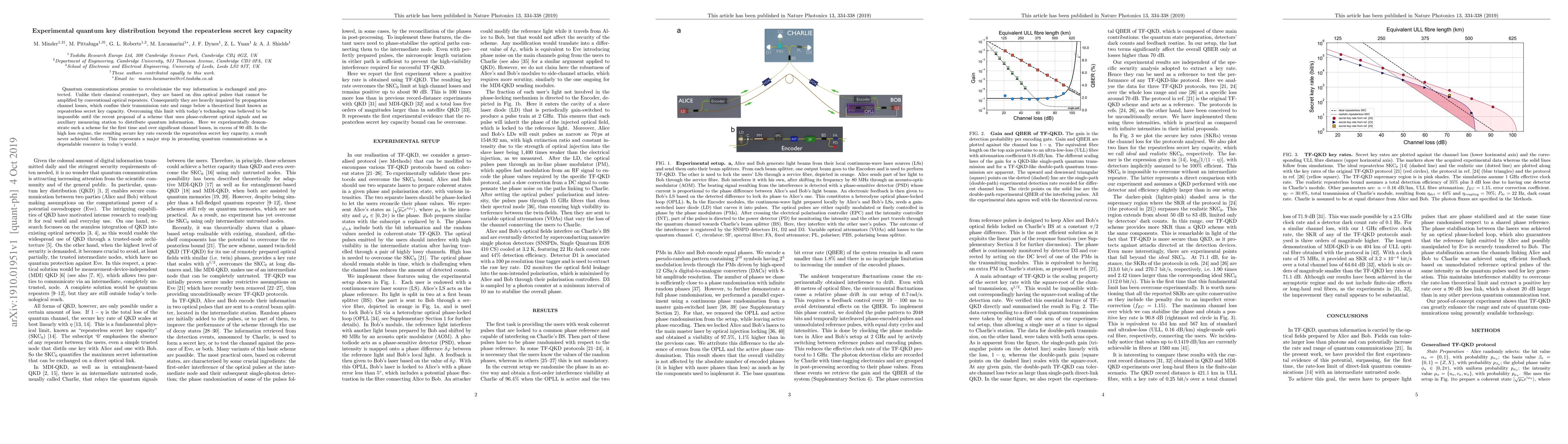 This paper experimentally demonstrates a novel quantum key distribution scheme that surpasses the repeaterless secret key capacity, overcoming significant channel losses exceeding 90 dB. This breakthrough represents a major advancement in making quantum communications a reliable technology.