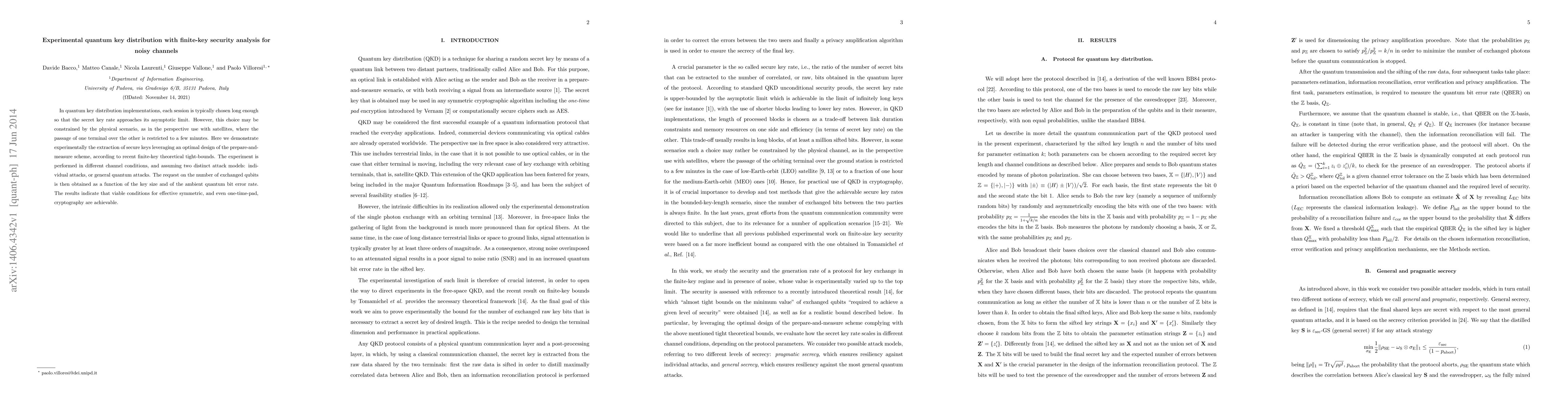 This paper presents an experimental demonstration of quantum key distribution with finite-key security analysis in noisy channels, using an optimized prepare-and-measure scheme. Results show that secure key extraction is feasible under realistic conditions, including satellite scenarios, with a manageable number of exchanged qubits for given key sizes and quantum bit error rates.