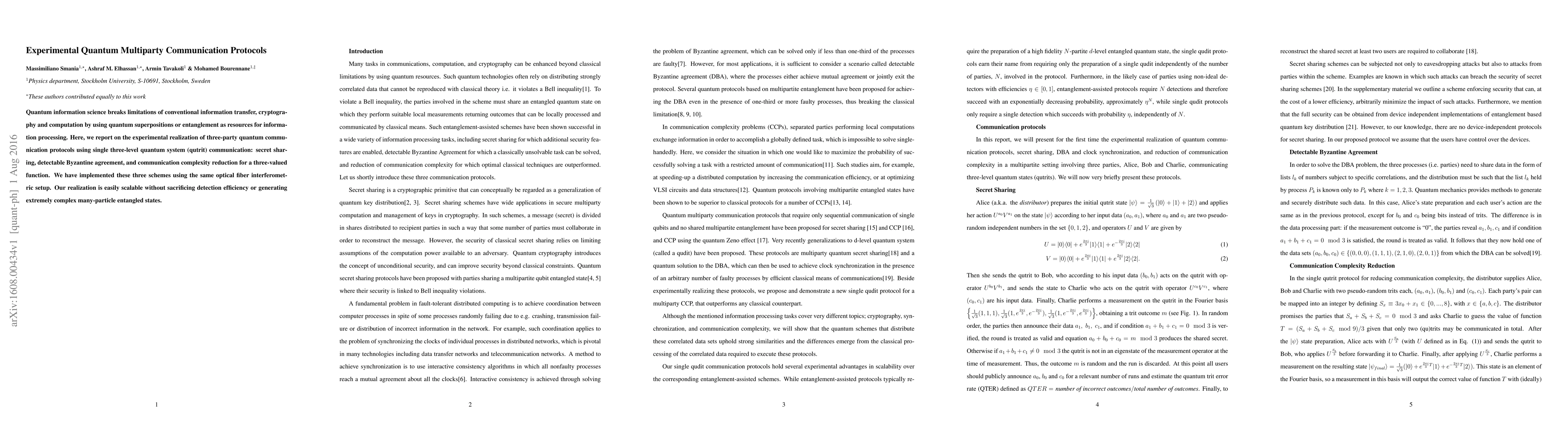 This paper experimentally realizes three-party quantum communication protocols using a single three-level quantum system (qutrit) in an optical fiber interferometric setup, demonstrating secret sharing, detectable Byzantine agreement, and communication complexity reduction. The protocols are scalable and avoid generating complex entangled states.
