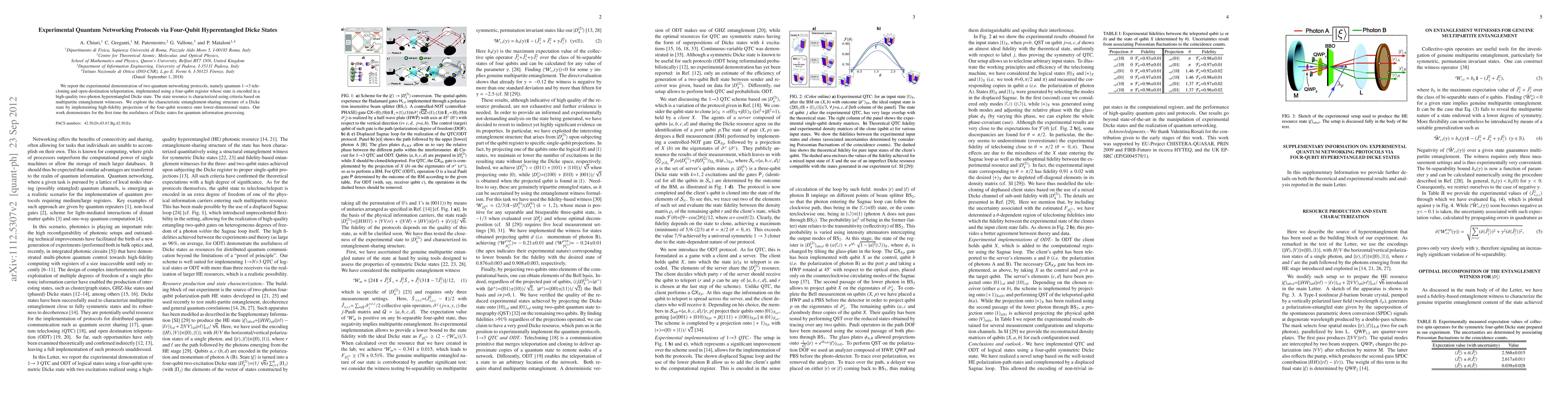 We report the experimental demonstration of two quantum networking protocols, namely quantum 1->3 telecloning and open-destination teleportation, implemented using a four-qubit register whose state is encoded in a high-quality two-photon hyperentangled Dicke state. The state resource is characterized using criteria based on multipartite entanglement witnesses. We explore the characteristic entanglement-sharing structure of a Dicke state by implementing high-fidelity projections of the four-qubit resource onto lower-dimensional states. Our work demonstrates for the first time the usefulness of Dicke states for quantum information processing.
