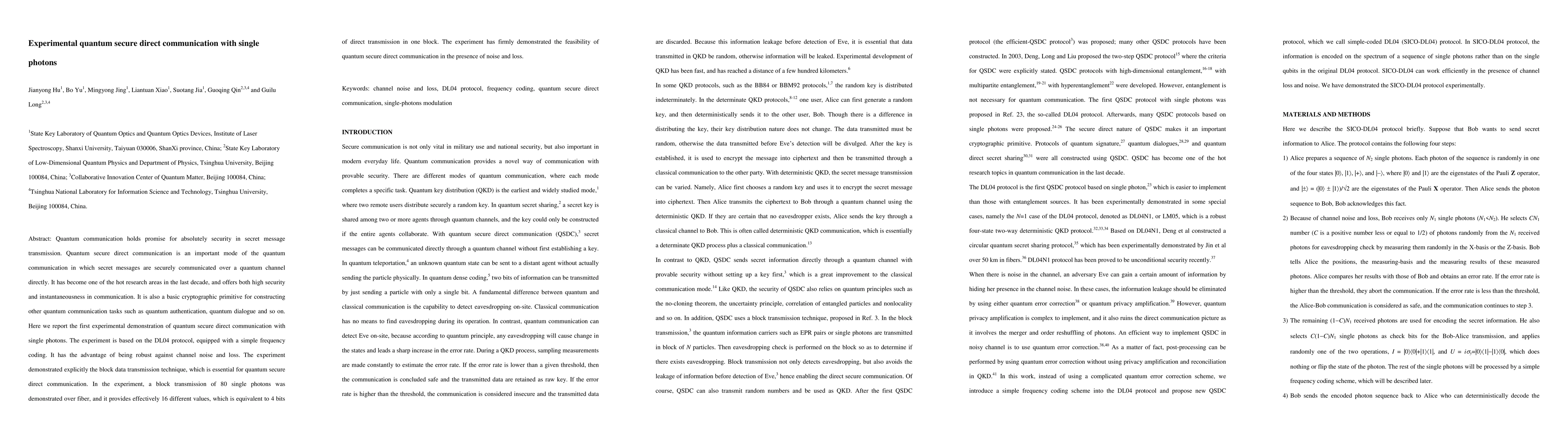 This paper presents the first experimental demonstration of quantum secure direct communication using single photons based on the DL04 protocol, showcasing robust block data transmission over fiber. The experiment successfully transmitted 80 photons in a block, effectively conveying 4 bits of secure information, proving the protocol's feasibility in noisy environments.