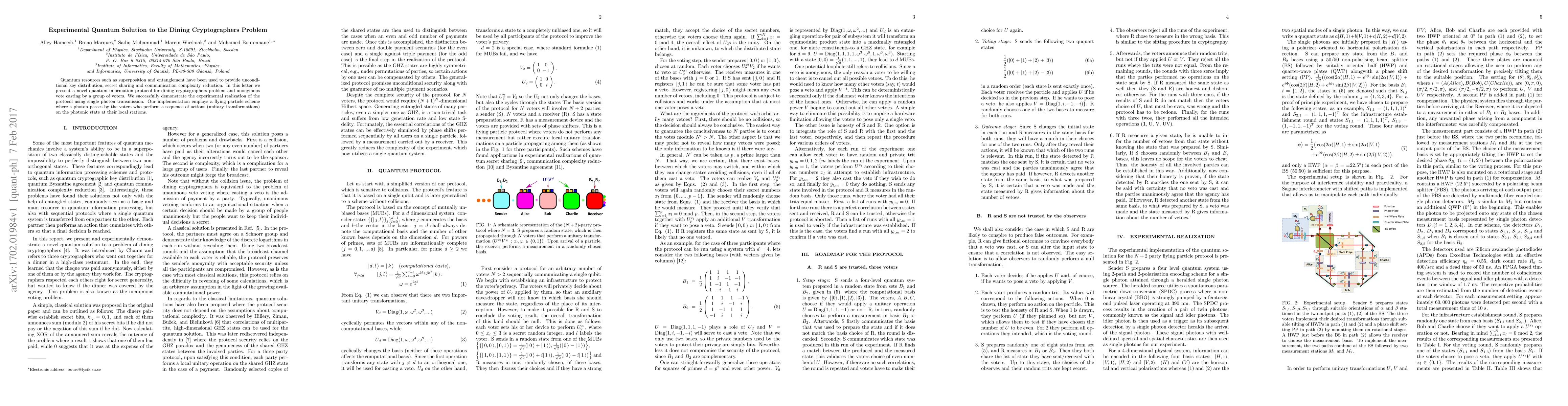 This paper proposes a quantum protocol for solving the dining cryptographers problem and anonymous vote casting, demonstrating its experimental realization using single photon transmission and unitary transformations on photonic states. The implementation showcases the potential of quantum mechanics for secure communication.