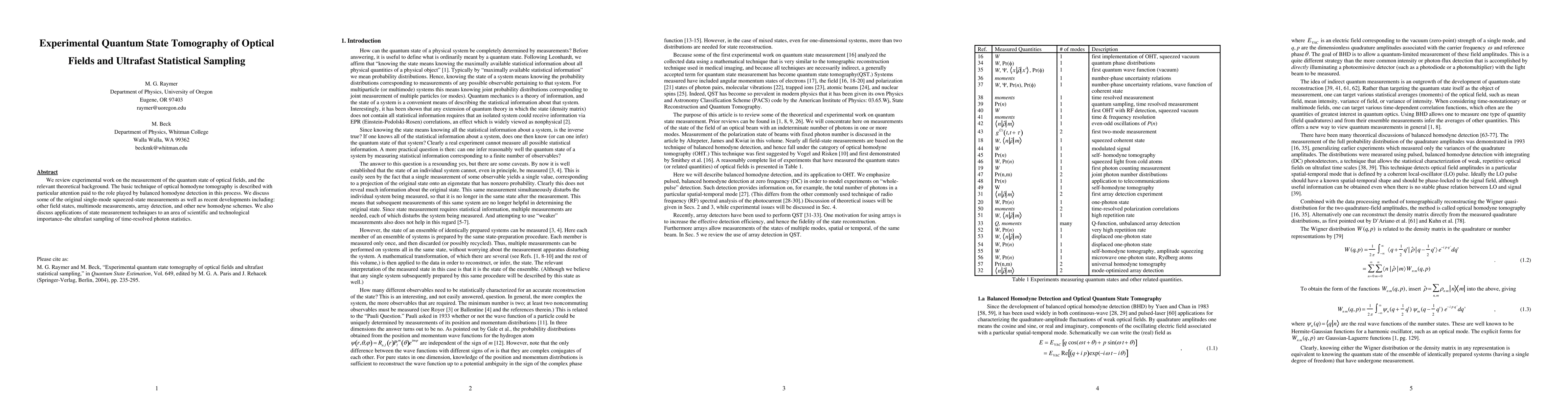 This paper reviews experimental quantum state tomography techniques for optical fields, focusing on optical homodyne tomography and balanced homodyne detection. It covers advancements in single-mode squeezed-state measurements, multimode measurements, and ultrafast statistical sampling of photon statistics.