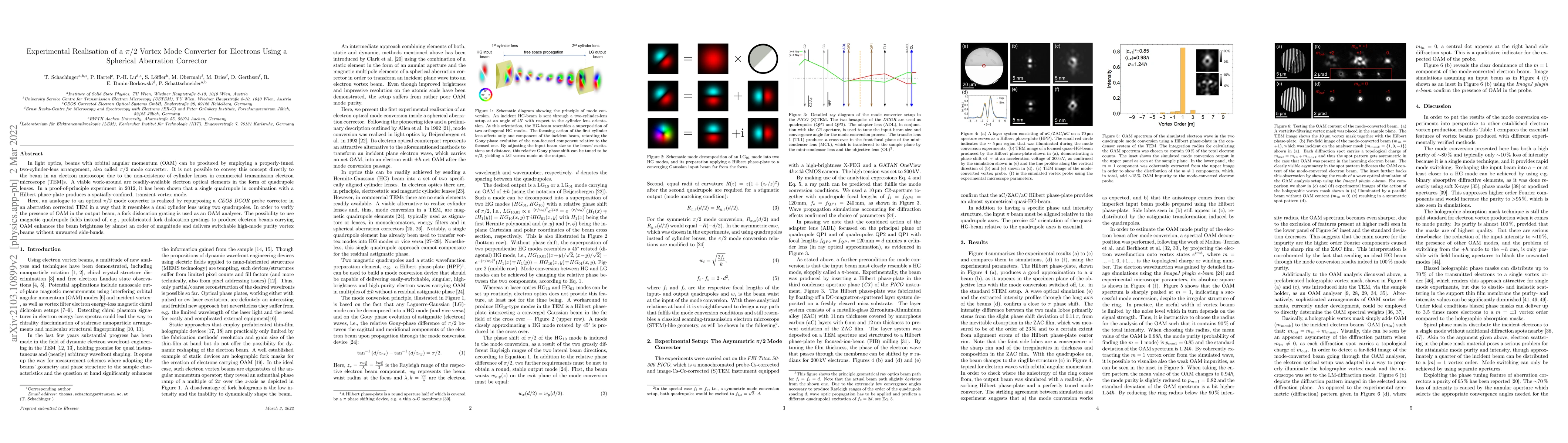 In light optics, beams with orbital angular momentum (OAM) can be produced by employing a properly-tuned two-cylinder-lens arrangement, also called $\pi$/2 mode converter. It is not possible to convey this concept directly to the beam in an electron microscope due to the non-existence of cylinder lenses in commercial transmission electron microscope (TEM). A viable work-around are readily-available electron optical elements in the form of quadrupole lenses. In a proof-of-principle experiment in 2012, it has been shown that a single quadrupole in combination with a Hilbert phase plate produces a spatially-confined, transient vortex mode. Here, an analogue to an optical $\pi$/2 mode converter is realized by repurposing a CEOS DCOR probe corrector in an aberration corrected TEM in a way that it resembles a dual cylinder lens using two quadrupoles. In order to verify the presence of OAM in the output beam, a fork dislocation grating is used as an OAM analyser. The possibility to use magnetic quadrupole fields instead of, e.g., prefabricated fork dislocation gratings to produce electron beams carrying OAM enhances the beam brightness by almost an order of magnitude and delivers switchable high-mode purity vortex beams without unwanted side-bands.