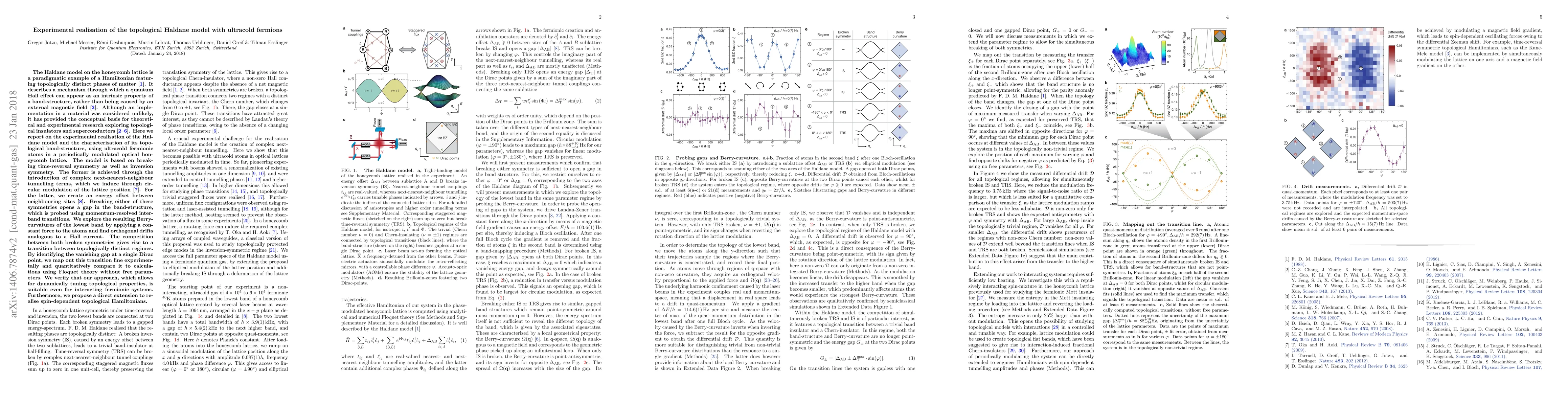 The Haldane model on the honeycomb lattice is a paradigmatic example of a Hamiltonian featuring topologically distinct phases of matter. It describes a mechanism through which a quantum Hall effect can appear as an intrinsic property of a band-structure, rather than being caused by an external magnetic field. Although an implementation in a material was considered unlikely, it has provided the conceptual basis for theoretical and experimental research exploring topological insulators and superconductors. Here we report on the experimental realisation of the Haldane model and the characterisation of its topological band-structure, using ultracold fermionic atoms in a periodically modulated optical honeycomb lattice. The model is based on breaking time-reversal symmetry as well as inversion symmetry. The former is achieved through the introduction of complex next-nearest-neighbour tunnelling terms, which we induce through circular modulation of the lattice position. For the latter, we create an energy offset between neighbouring sites. Breaking either of these symmetries opens a gap in the band-structure, which is probed using momentum-resolved interband transitions. We explore the resulting Berry-curvatures of the lowest band by applying a constant force to the atoms and find orthogonal drifts analogous to a Hall current. The competition between both broken symmetries gives rise to a transition between topologically distinct regimes. By identifying the vanishing gap at a single Dirac point, we map out this transition line experimentally and quantitatively compare it to calculations using Floquet theory without free parameters. We verify that our approach, which allows for dynamically tuning topological properties, is suitable even for interacting fermionic systems. Furthermore, we propose a direct extension to realise spin-dependent topological Hamiltonians.