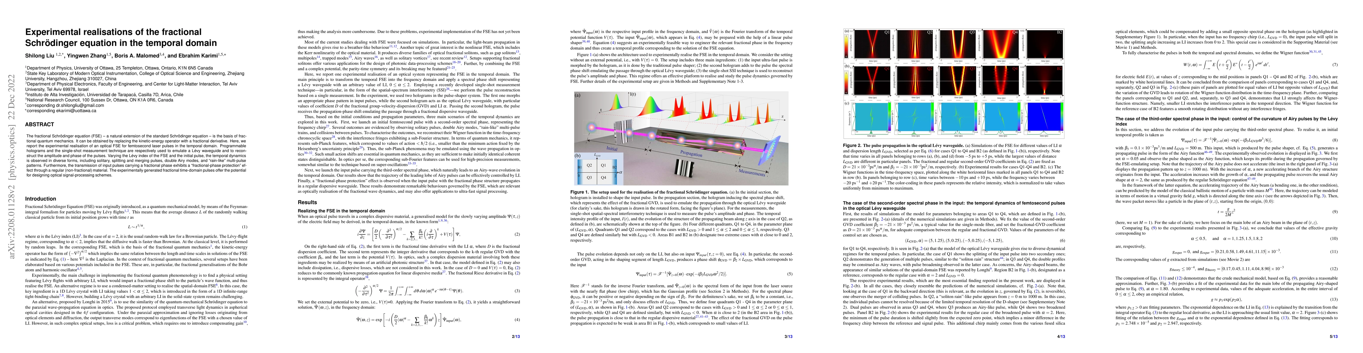 The fractional Schr\"{o}dinger equation (FSE) -- a natural extension of the standard Schr\"{o}dinger equation -- is the basis of fractional quantum mechanics. It can be obtained by replacing the kinetic-energy operator with a fractional derivative. Here, we report the experimental realisation of an optical FSE for femtosecond laser pulses in the temporal domain. Programmable holograms and the single-shot measurement technique are respectively used to emulate a \textit{L\'evy waveguide} and to reconstruct the amplitude and phase of the pulses. Varying the L\'evy index of the FSE and the initial pulse, the temporal dynamics is observed in diverse forms, including solitary, splitting and merging pulses, double Airy modes, and ``rain-like'' multi-pulse patterns. Furthermore, the transmission of input pulses carrying a fractional phase exhibits a ``fractional-phase protection'' effect through a regular (non-fractional) material. The experimentally generated fractional time-domain pulses offer the potential for designing optical signal-processing schemes.