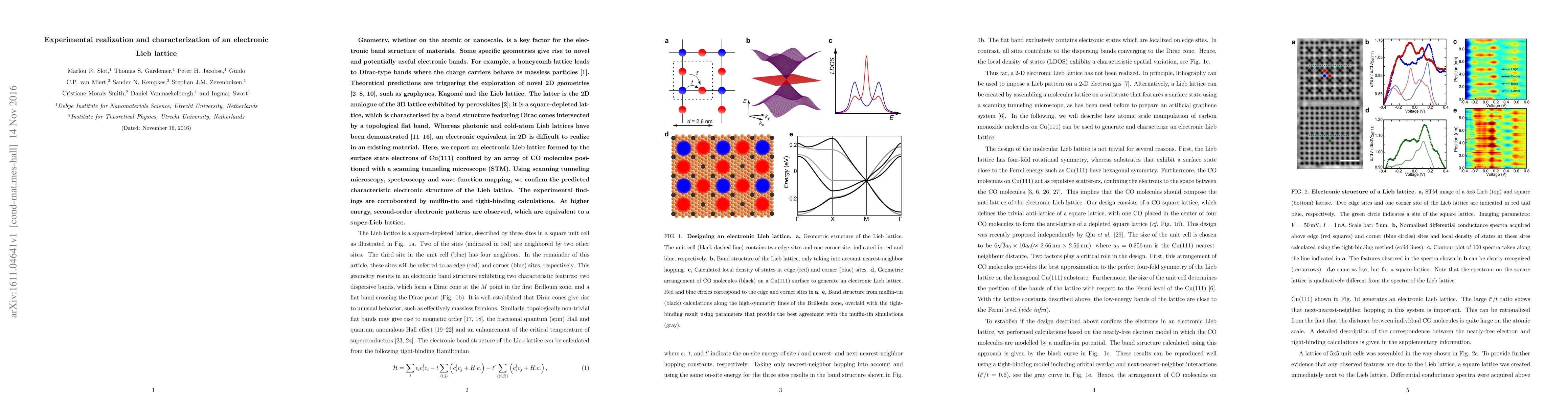 Geometry, whether on the atomic or nanoscale, is a key factor for the electronic band structure of materials. Some specific geometries give rise to novel and potentially useful electronic bands. For example, a honeycomb lattice leads to Dirac-type bands where the charge carriers behave as massless particles. Theoretical predictions are triggering the exploration of novel 2D geometries, such as graphynes, Kagom\'{e} and the Lieb lattice. The latter is the 2D analogue of the 3D lattice exhibited by perovskites; it is a square-depleted lattice, which is characterised by a band structure featuring Dirac cones intersected by a topological flat band. Whereas photonic and cold-atom Lieb lattices have been demonstrated, an electronic equivalent in 2D is difficult to realize in an existing material. Here, we report an electronic Lieb lattice formed by the surface state electrons of Cu(111) confined by an array of CO molecules positioned with a scanning tunneling microscope (STM). Using scanning tunneling microscopy, spectroscopy and wave-function mapping, we confirm the predicted characteristic electronic structure of the Lieb lattice. The experimental findings are corroborated by muffin-tin and tight-binding calculations. At higher energy, second-order electronic patterns are observed, which are equivalent to a super-Lieb lattice.