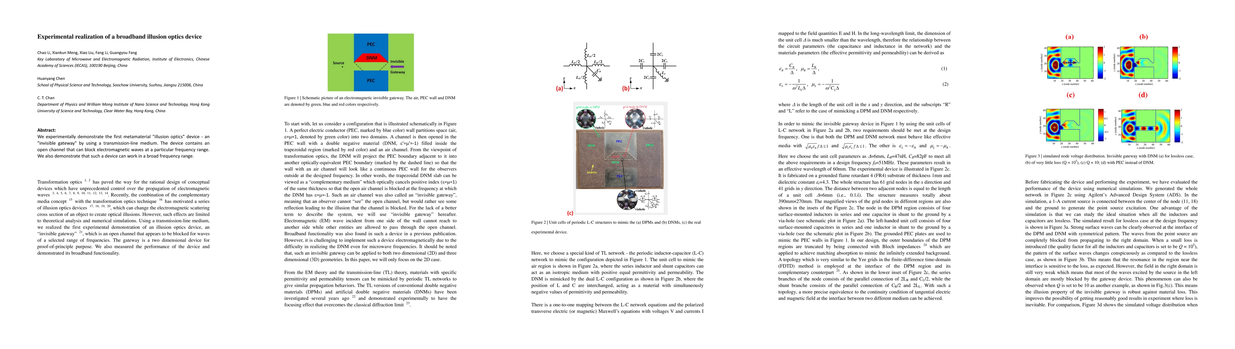 Summary: This paper presents the first experimental realization of a broadband metamaterial "illusion optics" device, termed an "invisible gateway," which can block electromagnetic waves over a wide frequency range using a transmission-line medium. The device's effectiveness across a broad spectrum is demonstrated.