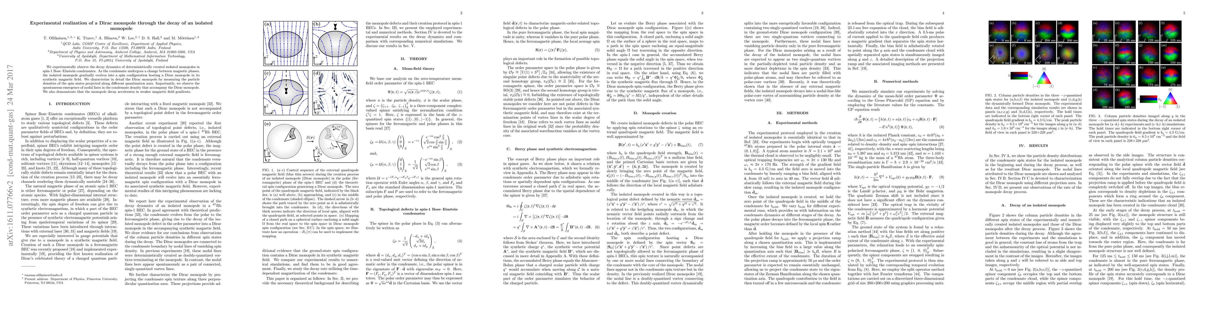 This paper reports the experimental observation of a Dirac monopole's formation from the decay of isolated monopoles in spin-1 Bose-Einstein condensates, characterized by measuring spin state densities and detecting nodal lines. The decay process accelerates in weaker magnetic field gradients, highlighting the synthetic magnetic field's role.