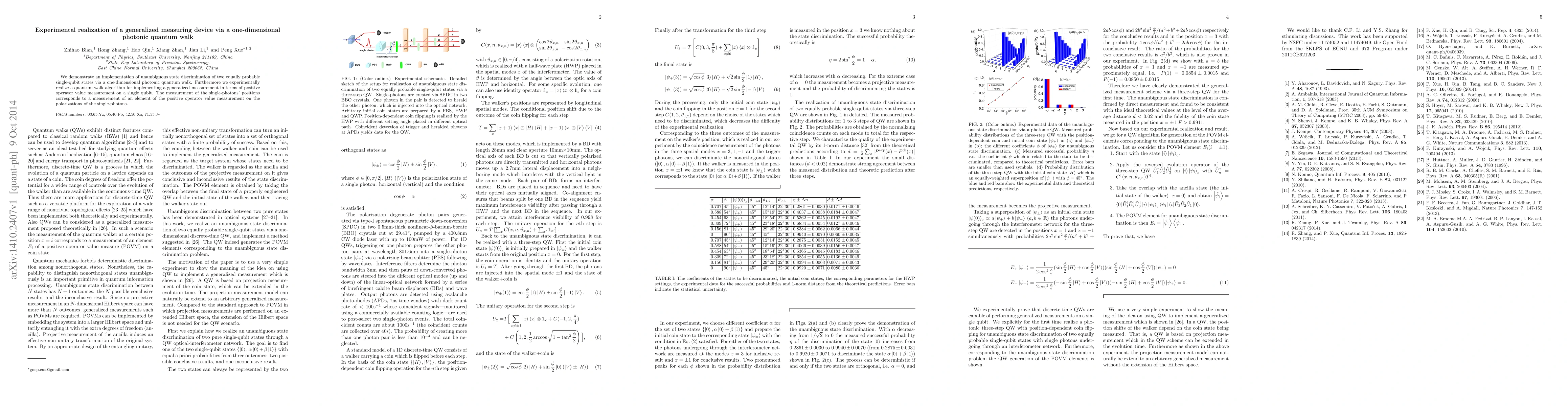 This paper presents an experimental setup using a one-dimensional photonic quantum walk to achieve unambiguous state discrimination of two equally probable single-qubit states. It also demonstrates a quantum walk algorithm for generalized measurement via positive operator value measurement on single-qubit polarization states.