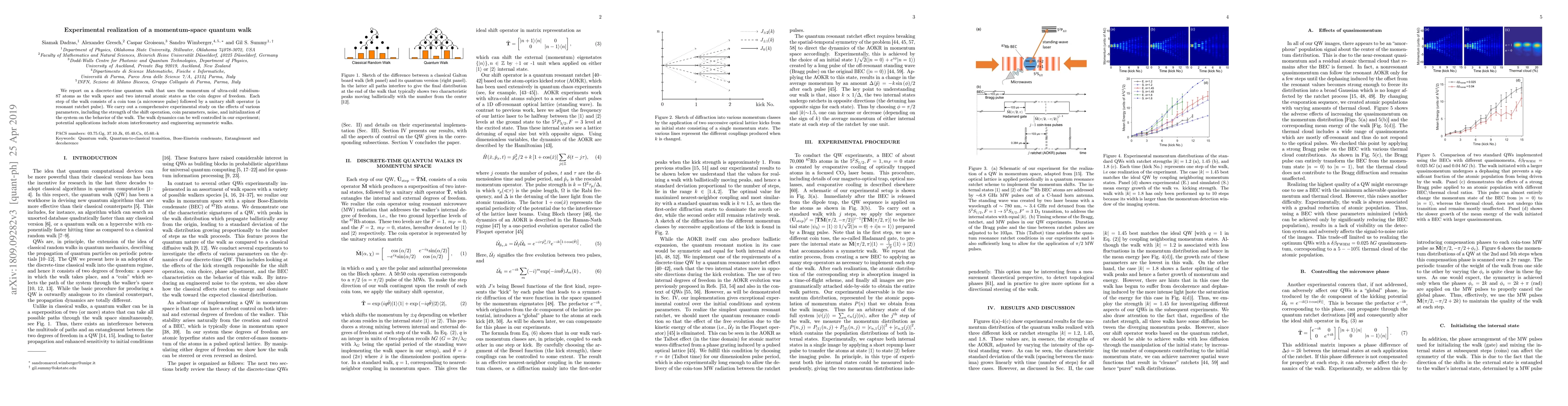 This paper details an experimental quantum walk using ultra-cold rubidium-87 atoms, where momentum serves as the walk space and internal states as the coin. The study investigates the effects of various parameters on the walk dynamics, demonstrating potential applications in atom interferometry and asymmetric walk engineering.