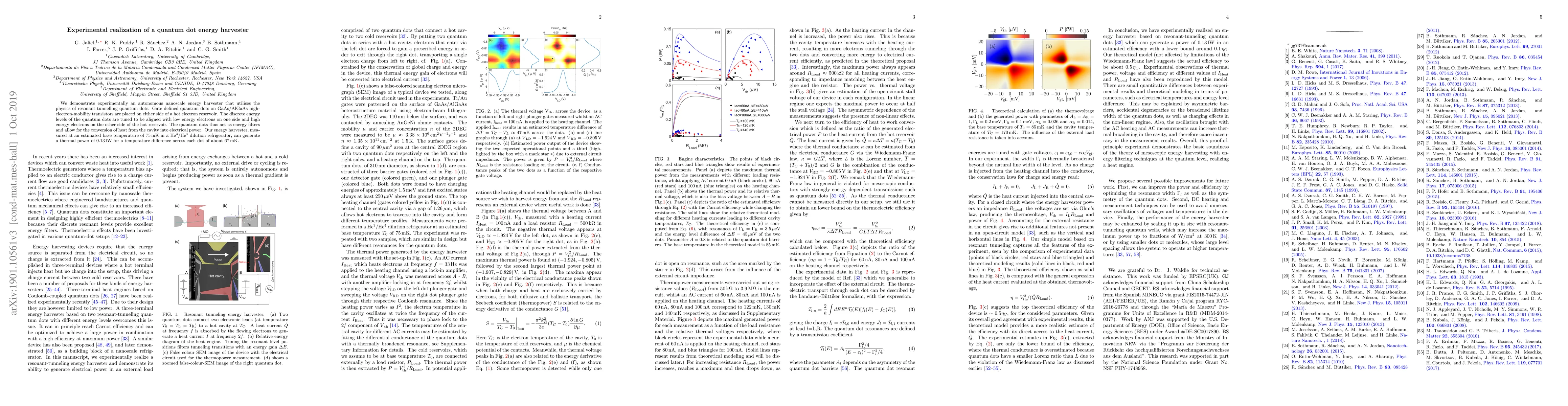 This paper experimentally demonstrates a nanoscale energy harvester based on resonant tunneling quantum dots, converting heat from a hot electron reservoir into electrical power, generating 0.13 fW at a base temperature of 75 mK. The quantum dots act as energy filters, enabling efficient thermal-to-electrical power conversion.