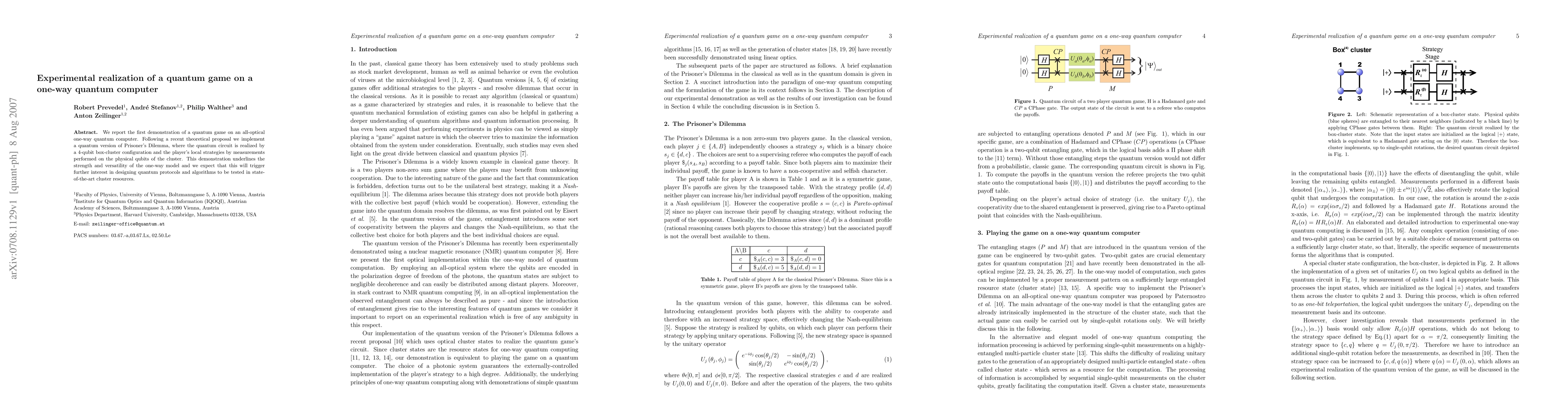 This study presents the first experimental implementation of a quantum version of the Prisoner's Dilemma on an all-optical one-way quantum computer using a 4-qubit box-cluster configuration, highlighting the model's potential for future quantum protocols.