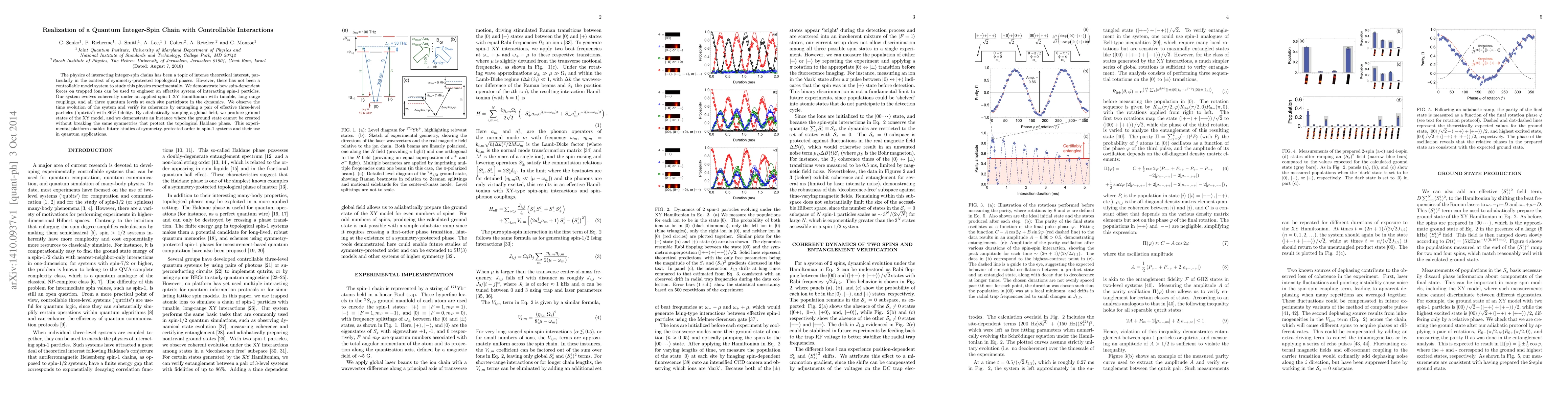The physics of interacting integer-spin chains has been a topic of intense theoretical interest, particularly in the context of symmetry-protected topological phases. However, there has not been a controllable model system to study this physics experimentally. We demonstrate how spin-dependent forces on trapped ions can be used to engineer an effective system of interacting spin-1 particles. Our system evolves coherently under an applied spin-1 XY Hamiltonian with tunable, long-range couplings, and all three quantum levels at each site participate in the dynamics. We observe the time evolution of the system and verify its coherence by entangling a pair of effective three-level particles (`qutrits') with 86% fidelity. By adiabatically ramping a global field, we produce ground states of the XY model, and we demonstrate an instance where the ground state cannot be created without breaking the same symmetries that protect the topological Haldane phase. This experimental platform enables future studies of symmetry-protected order in spin-1 systems and their use in quantum applications.
