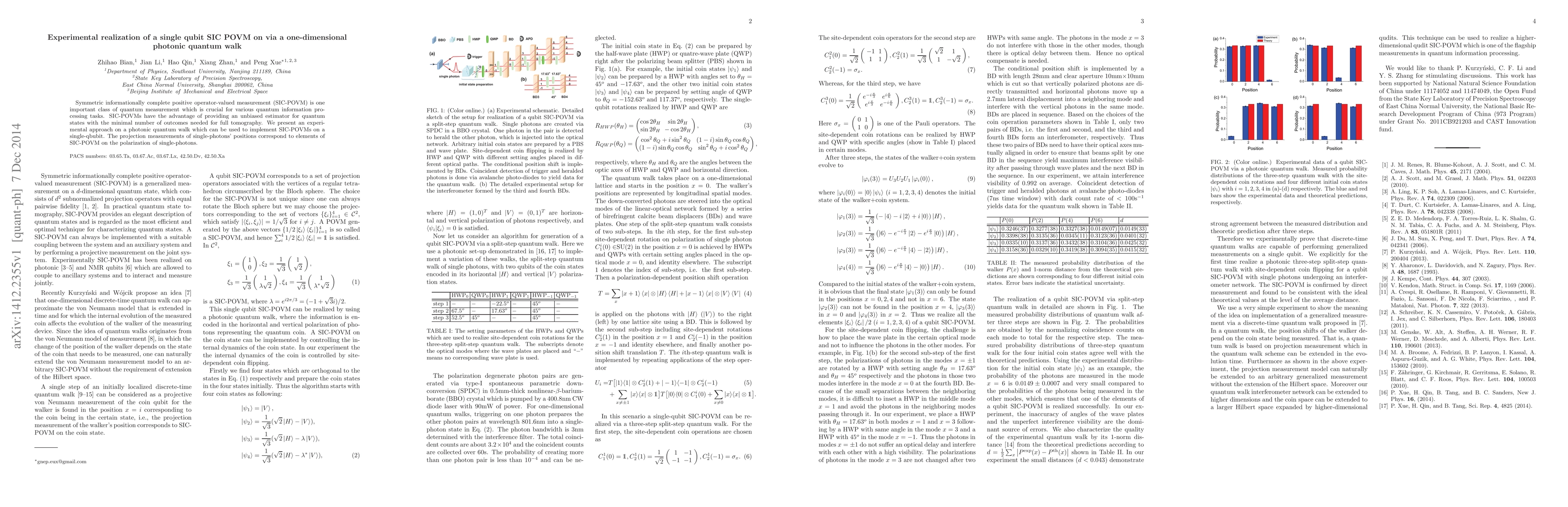 This paper details an experimental setup using a one-dimensional photonic quantum walk to implement a single-qubit symmetric informationally complete positive operator-valued measurement (SIC-POVM). The method leverages the positions of single-photons to achieve unbiased state estimation with minimal outcomes.