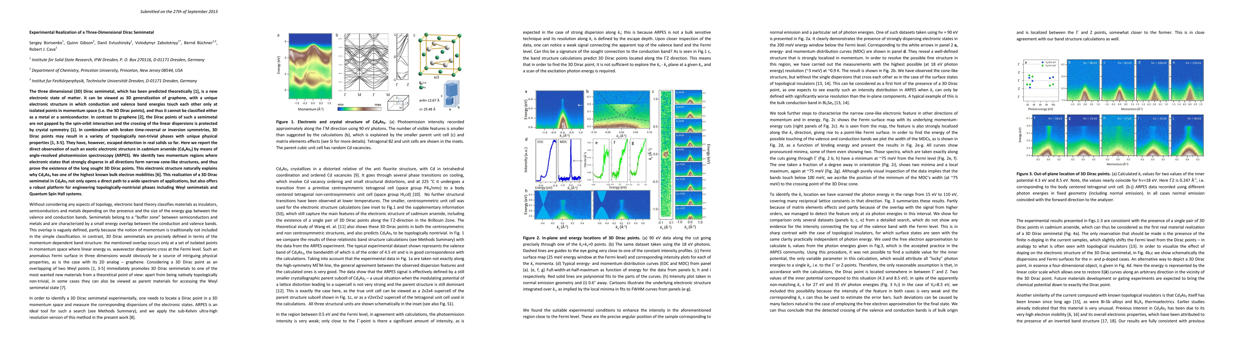 Researchers have experimentally confirmed the existence of a three-dimensional Dirac semimetal in cadmium arsenide (Cd3As2) using angle-resolved photoemission spectroscopy. This discovery reveals cone-like electronic structures in two momentum regions, confirming the presence of 3D Dirac points and paving the way for potential applications in topological phases and materials.