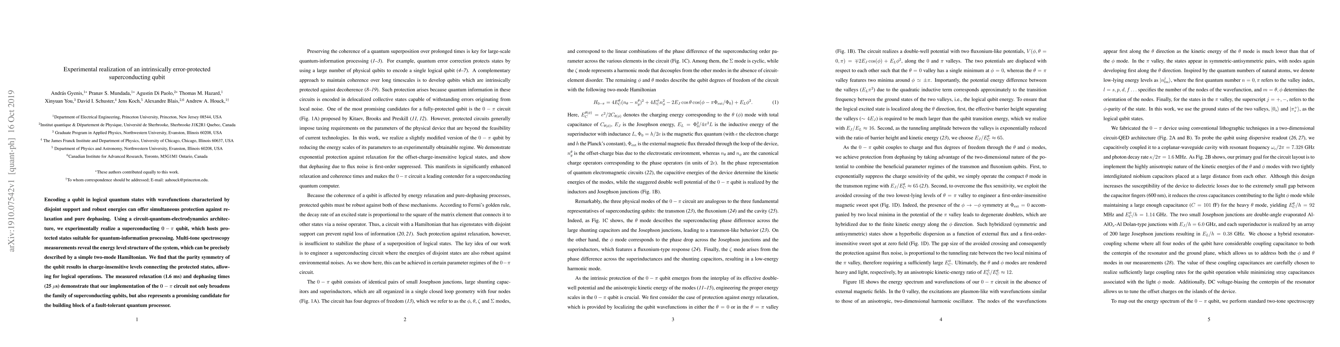 Encoding a qubit in logical quantum states with wavefunctions characterized by disjoint support and robust energies can offer simultaneous protection against relaxation and pure dephasing. Using a circuit-quantum-electrodynamics architecture, we experimentally realize a superconducting $0-\pi$ qubit, which hosts protected states suitable for quantum-information processing. Multi-tone spectroscopy measurements reveal the energy level structure of the system, which can be precisely described by a simple two-mode Hamiltonian. We find that the parity symmetry of the qubit results in charge-insensitive levels connecting the protected states, allowing for logical operations. The measured relaxation (1.6 ms) and dephasing times (25 $\mu$s) demonstrate that our implementation of the $0-\pi$ circuit not only broadens the family of superconducting qubits, but also represents a promising candidate for the building block of a fault-tolerant quantum processor.