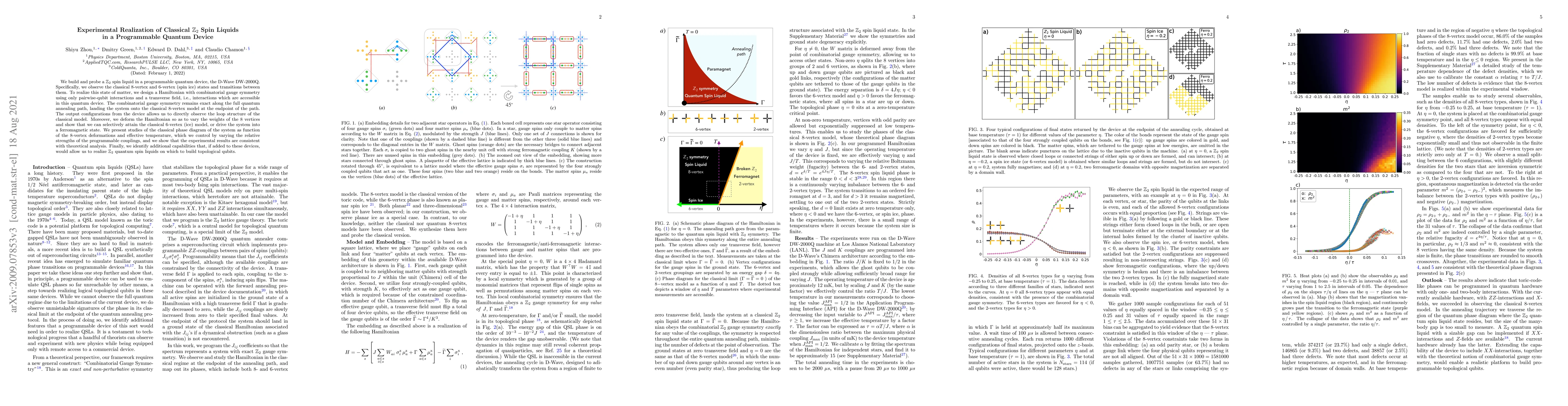 We build and probe a $\mathbb{Z}_2$ spin liquid in a programmable quantum device, the D-Wave DW-2000Q. Specifically, we observe the classical 8-vertex and 6-vertex (spin ice) states and transitions between them. To realize this state of matter, we design a Hamiltonian with combinatorial gauge symmetry using only pairwise-qubit interactions and a transverse field, i.e., interactions which are accessible in this quantum device. The combinatorial gauge symmetry remains exact along the full quantum annealing path, landing the system onto the classical 8-vertex model at the endpoint of the path. The output configurations from the device allows us to directly observe the loop structure of the classical model. Moreover, we deform the Hamiltonian so as to vary the weights of the 8 vertices and show that we can selectively attain the classical 6-vertex (ice) model, or drive the system into a ferromagnetic state. We present studies of the classical phase diagram of the system as function of the 8-vertex deformations and effective temperature, which we control by varying the relative strengths of the programmable couplings, and we show that the experimental results are consistent with theoretical analysis. Finally, we identify additional capabilities that, if added to these devices, would allow us to realize $\mathbb{Z}_2$ quantum spin liquids on which to build topological qubits.