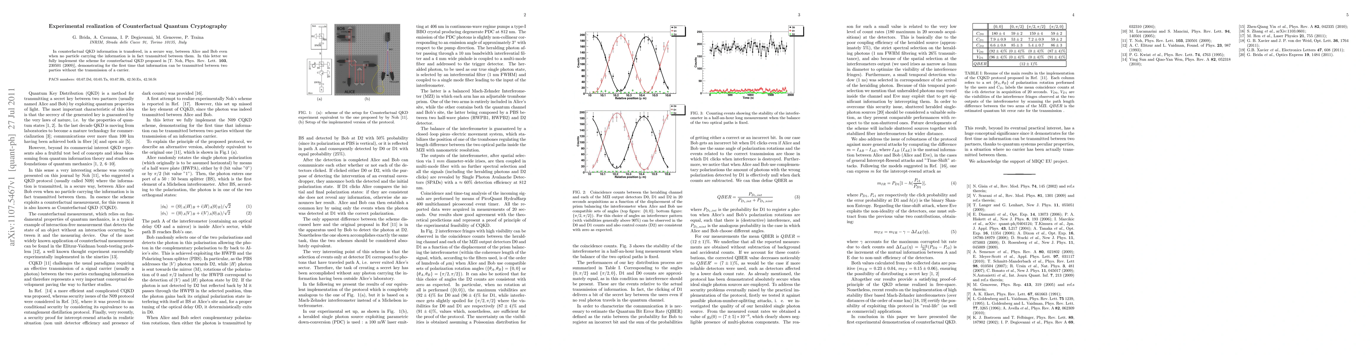 In counterfactual QKD information is transfered, in a secure way, between Alice and Bob even when no particle carrying the information is in fact transmitted between them. In this letter we fully implement the scheme for counterfactual QKD proposed in [T. Noh, \PRL \textbf{103}, 230501 (2009)], demonstrating for the first time that information can be transmitted between two parties without the transmission of a carrier.