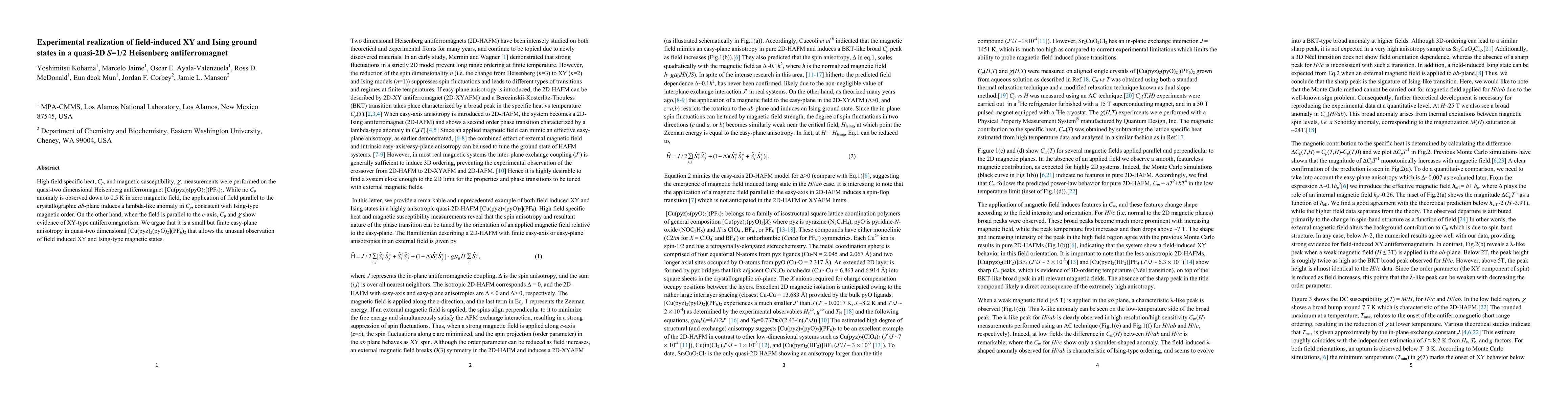 High field specific heat, Cp, and magnetic susceptibility, \c{hi}, measurements were performed on the quasi-two dimensional Heisenberg antiferromagnet [Cu(pyz)2(pyO)2](PF6)2. While no Cp anomaly is observed down to 0.5 K in zero magnetic field, the application of field parallel to the crystallographic ab-plane induces a lambda-like anomaly in Cp, consistent with Ising-type magnetic order. On the other hand, when the field is parallel to the c-axis, Cp and \c{hi} show evidence of XY-type antiferromagnetism. We argue that it is a small but finite easy-plane anisotropy in quasi-two dimensional [Cu(pyz)2(pyO)2](PF6)2 that allows the unusual observation of field induced XY and Ising-type magnetic states.