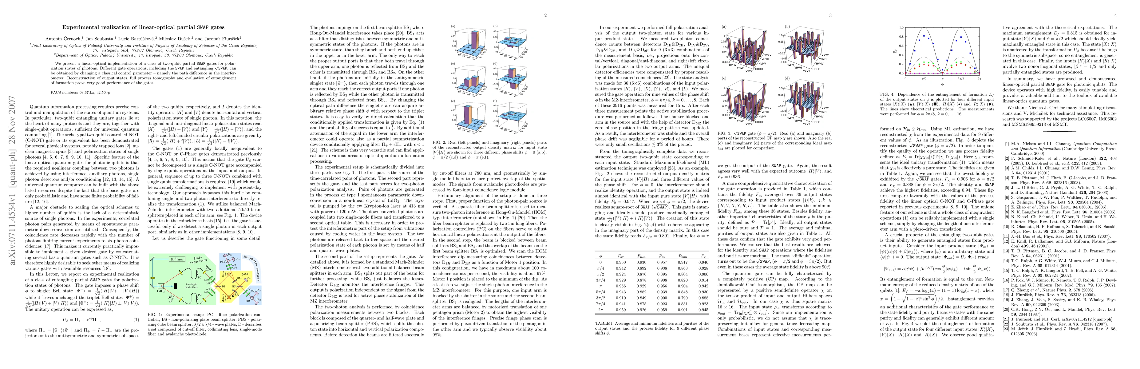 This paper details a linear-optical implementation of two-qubit partial SWAP gates for photon polarization states, achieved by adjusting the path difference in the interferometer. The study demonstrates high-performance output states and successful entanglement formation through process tomography.