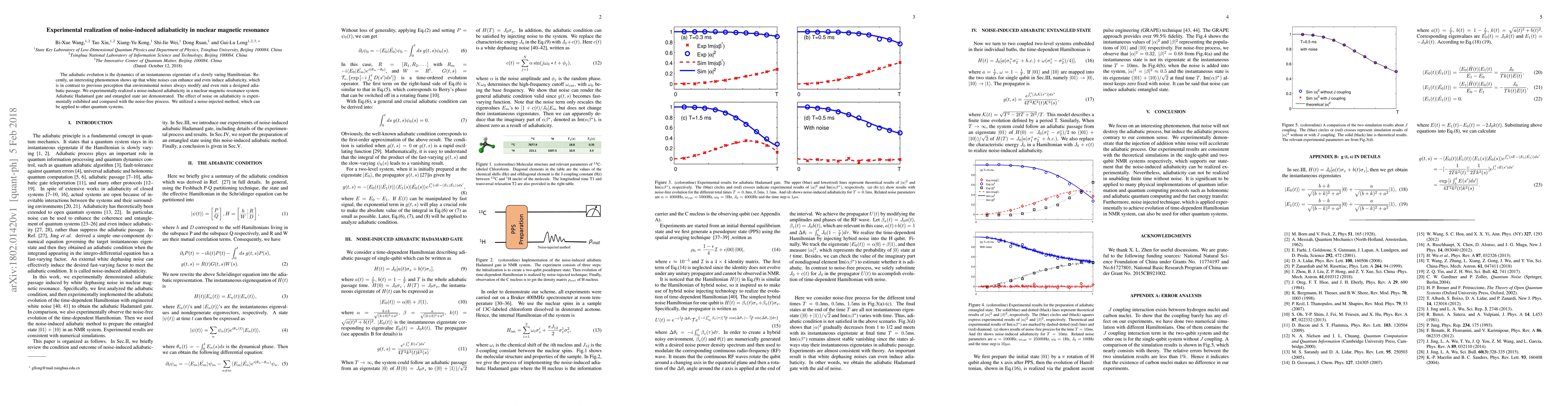 This paper demonstrates experimental realization of noise-induced adiabaticity in nuclear magnetic resonance, showing that white noise can enhance and induce adiabatic processes contrary to previous beliefs. The study successfully implements an adiabatic Hadamard gate and entangled states, comparing the effects of noise against noise-free processes, and proposes a noise-injected method applicable to other quantum systems.