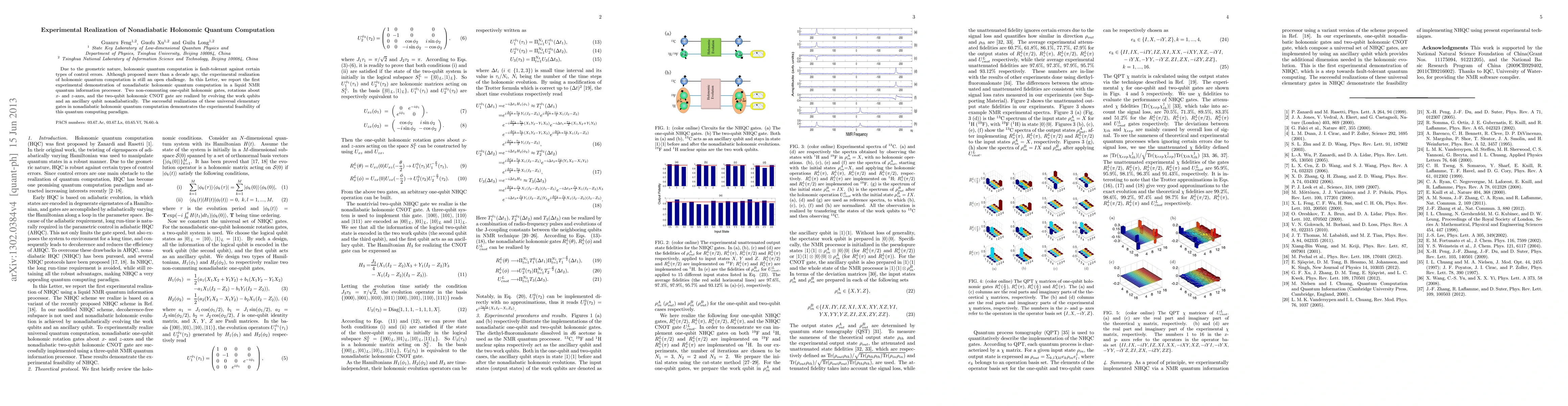 This paper reports the first experimental realization of nonadiabatic holonomic quantum computation using liquid NMR quantum information processors, demonstrating high-fidelity implementation of universal single-qubit and two-qubit gates, showcasing the fault-tolerance and potential of this quantum computing paradigm.