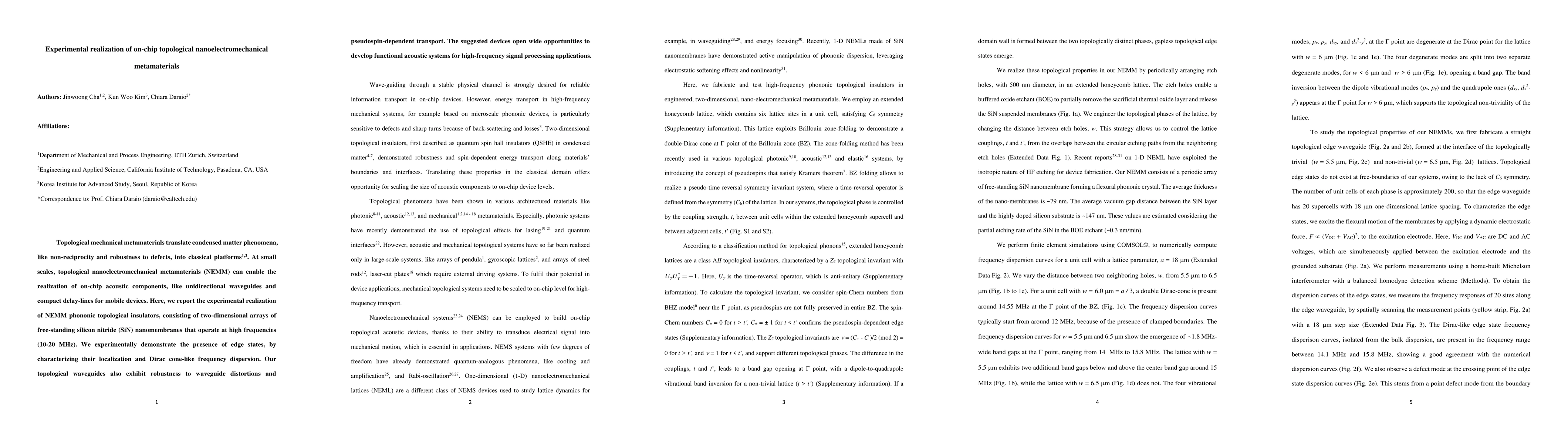 The paper presents the experimental realization of on-chip topological nanoelectromechanical metamaterials, demonstrating edge states' localization, Dirac cone-like dispersion, and robustness to distortions.