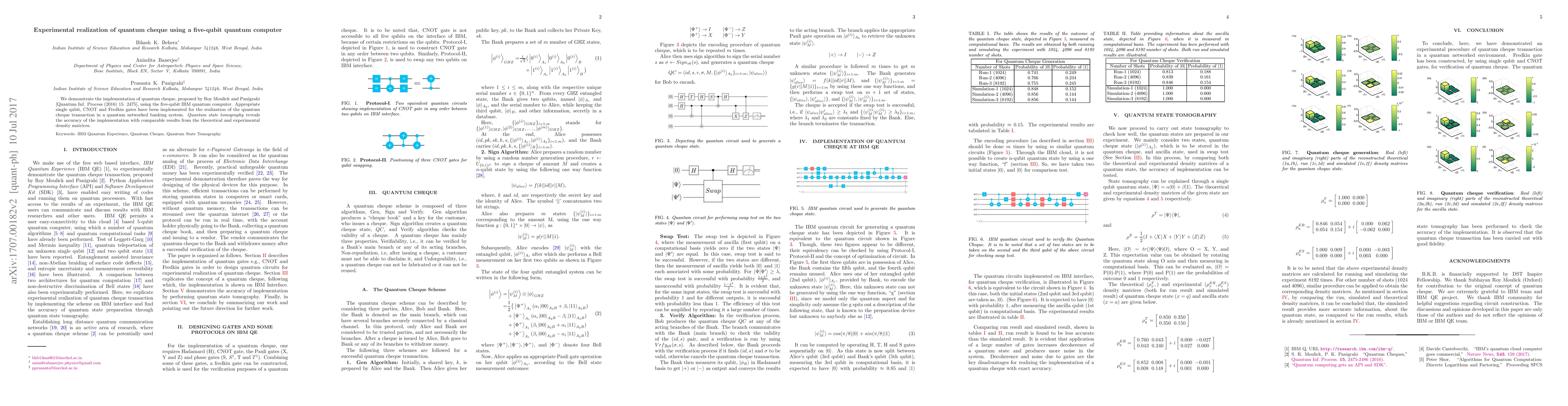 This paper demonstrates the experimental realization of a quantum cheque on a five-qubit IBM quantum computer, implementing necessary quantum gates and validating the process through quantum state tomography, showing high accuracy in quantum networked banking systems.
