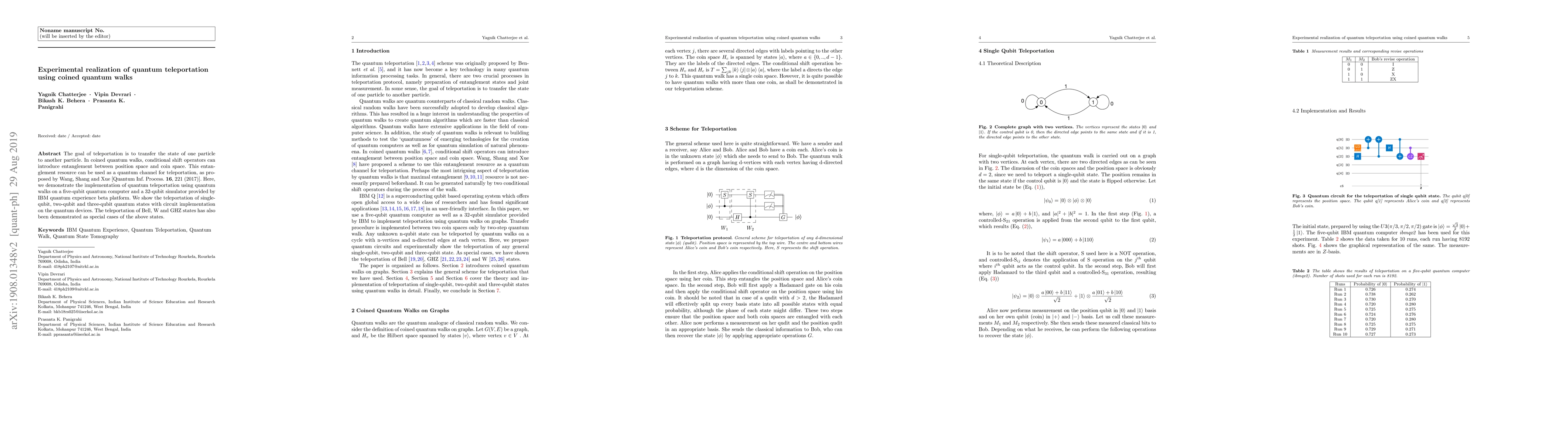 This research demonstrates quantum teleportation using coined quantum walks on a five-qubit quantum computer and a 32-qubit simulator. The study successfully teleports single, two, and three-qubit states, including Bell, W, and GHZ states, leveraging entanglement introduced by conditional shift operators in quantum walks.
