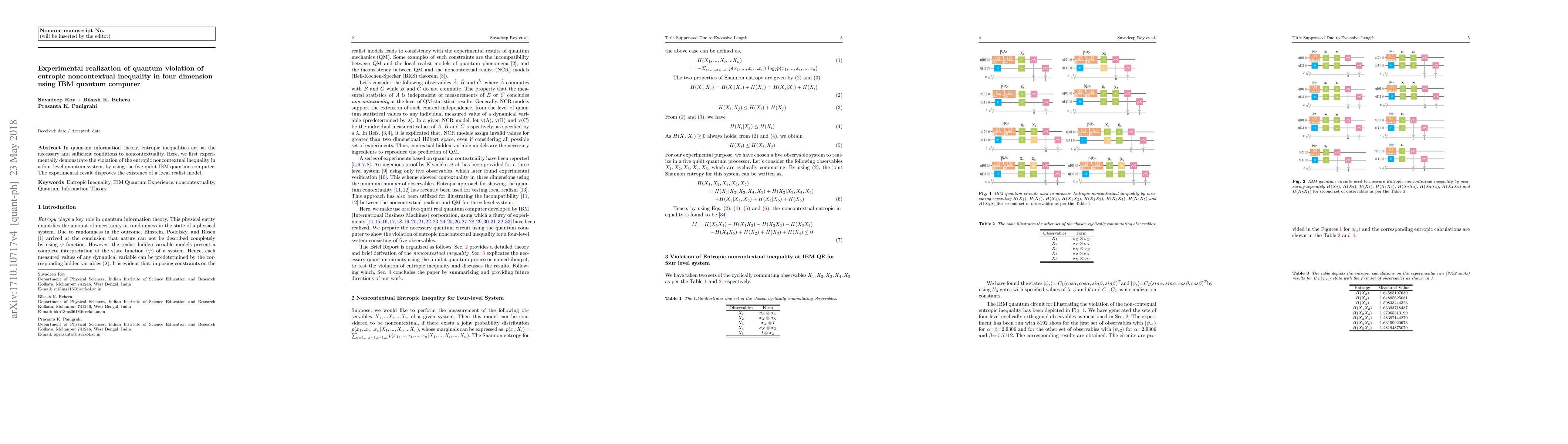 This paper experimentally demonstrates the violation of entropic noncontextual inequality in a four-level quantum system using an IBM quantum computer, thereby disproving the existence of a local realist model. The results highlight the non-classical nature of quantum mechanics.