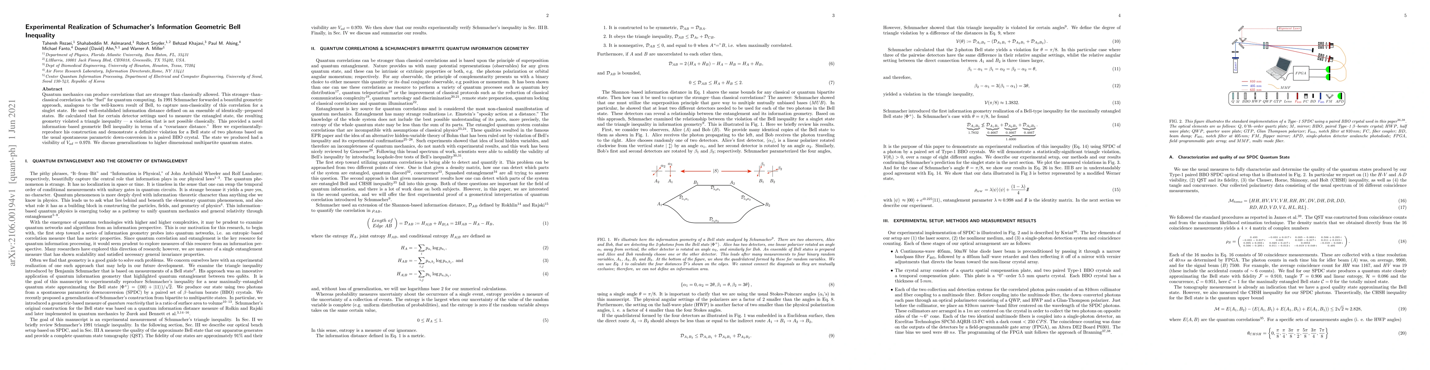 Quantum mechanics can produce correlations that are stronger than classically allowed. This stronger-than-classical correlation is the "fuel" for quantum computing. In 1991 Schumacher forwarded a beautiful geometric approach, analogous to the well-known result of Bell, to capture non-classicality of this correlation for a singlet state. He used well-established information distance defined on an ensemble of identically-prepared states. He calculated that for certain detector settings used to measure the entangled state, the resulting geometry violated a triangle inequality -- a violation that is not possible classically. This provided a novel information-based geometric Bell inequality in terms of a "covariance distance." Here we experimentally-reproduce his construction and demonstrate a definitive violation for a Bell state of two photons based on the usual spontaneous parametric down-conversion in a paired BBO crystal. The state we produced had a visibility of $V_{ad}=0.970$. We discuss generalizations to higher dimensional multipartite quantum states.