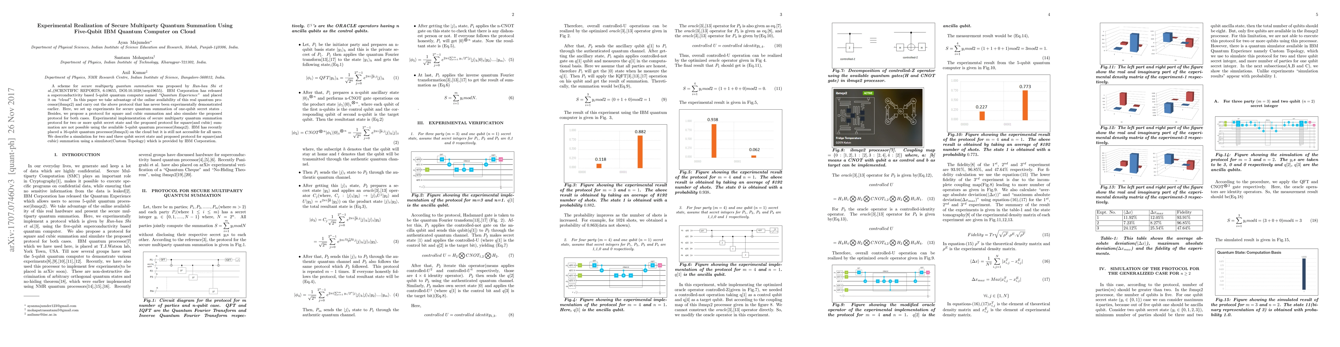 This paper demonstrates the experimental realization of a secure multiparty quantum summation protocol using IBM's 5-qubit quantum computer on cloud. The authors implement the protocol for one-qubit secret states and propose extensions for square and cubic summation, though full experiments for larger qubit states are limited by the processor's qubit count.
