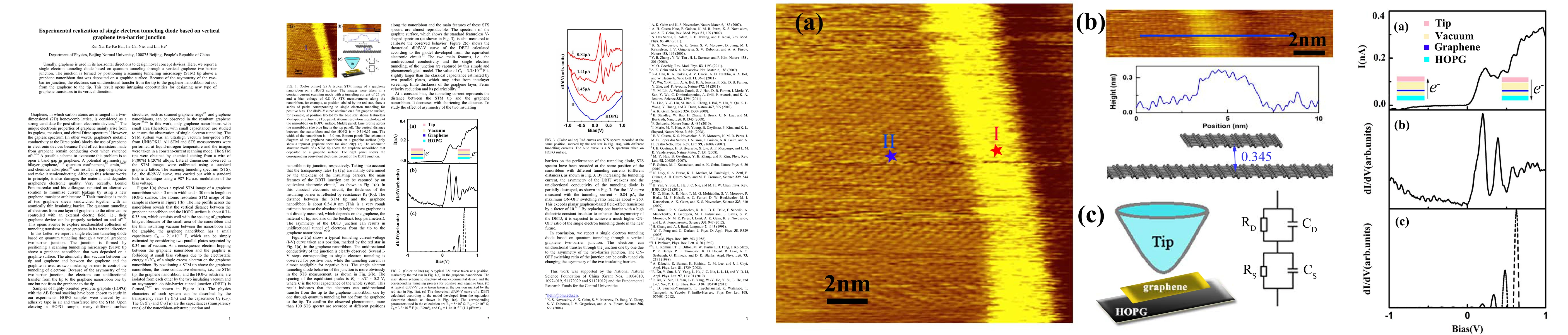 Usually, graphene is used in its horizontal directions to design novel concept devices. Here, we report a single electron tunneling diode based on quantum tunneling through a vertical graphene two-barrier junction. The junction is formed by positioning a scanning tunnelling microscopy (STM) tip above a graphene nanoribbon that was deposited on a graphite surface. Because of the asymmetry of the two-barrier junction, the electrons can unidirectional transfer from the tip to the graphene nanoribbon but not from the graphene to the tip. This result opens intriguing opportunities for designing new type of graphene transistors in its vertical direction.