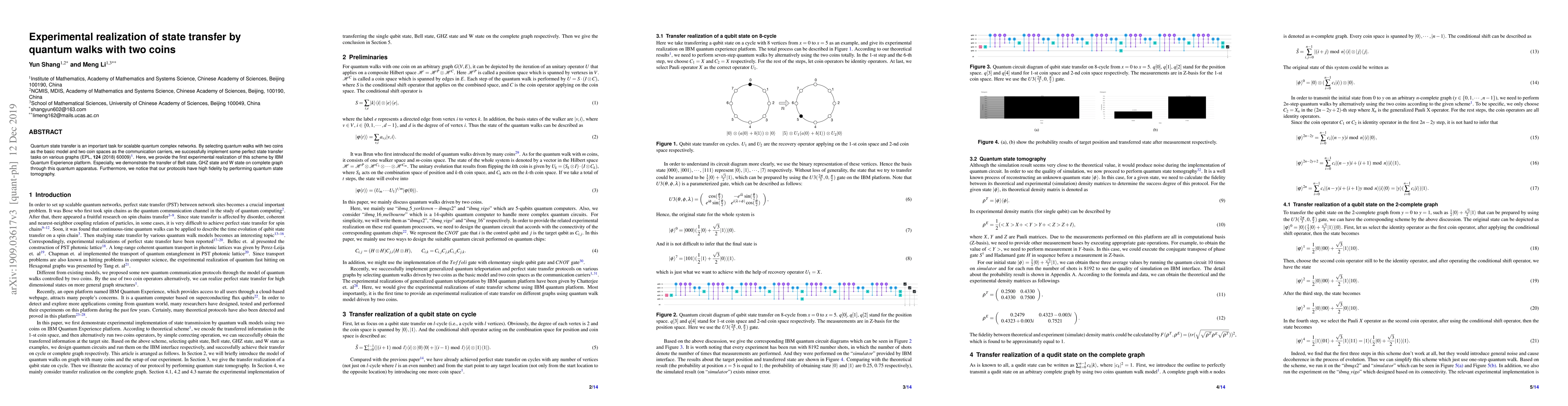 Title: Experimental realization of state transfer by quantum walks with two coins Summary: This study experimentally demonstrates quantum state transfer using two-coin quantum walks on IBM's quantum experience platform, successfully transferring Bell, GHZ, and W states on a complete graph, validated by high fidelity measurements via quantum state tomography.