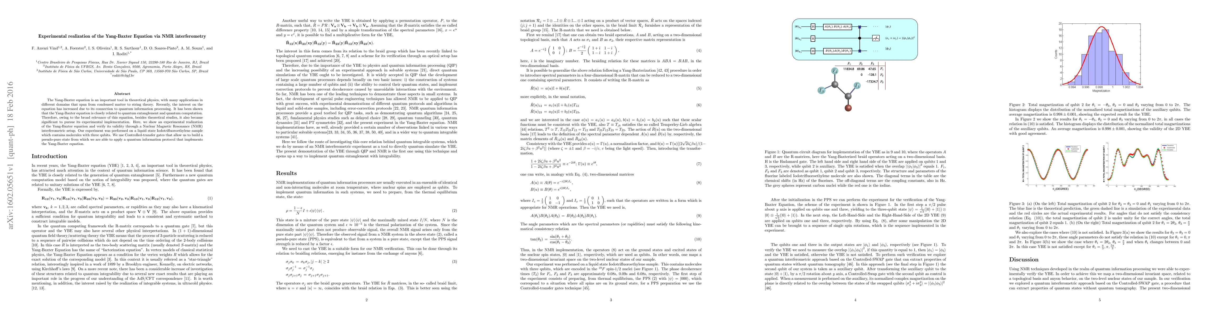 This paper presents an experimental realization of the Yang-Baxter equation using Nuclear Magnetic Resonance (NMR) interferometry on an Iodotrifluoroethylene sample with three qubits, verifying its relevance for quantum information processing through a controlled-transfer gate protocol.