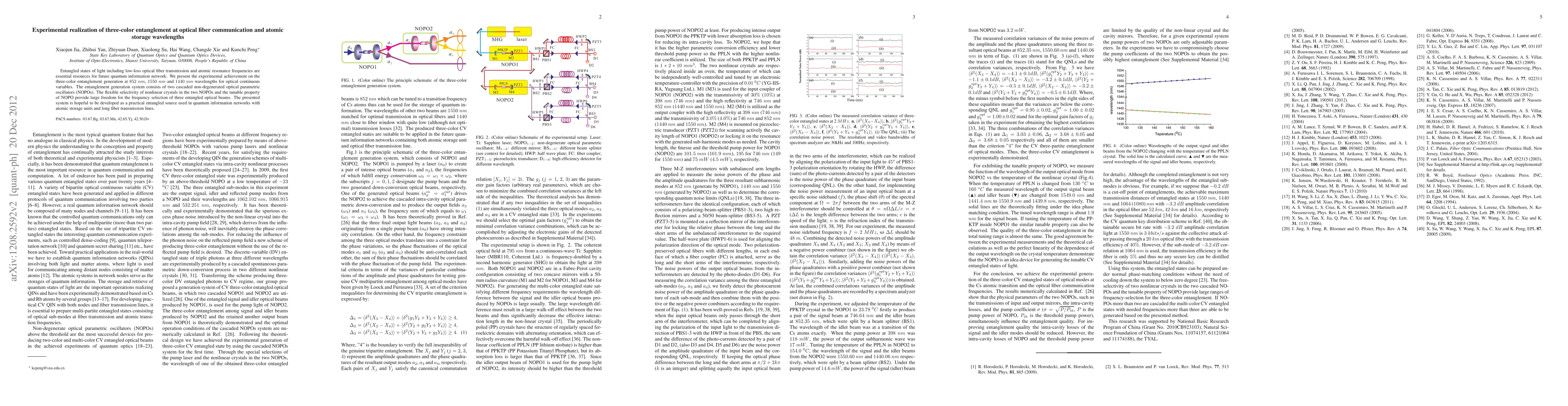 This paper reports the experimental generation of three-color entanglement at 852 nm, 1550 nm, and 1440 nm wavelengths using two cascaded non-degenerated optical parametric oscillators. The system's flexibility and tunable properties make it a promising candidate for future quantum information networks integrating optical fiber communication and atomic storage.