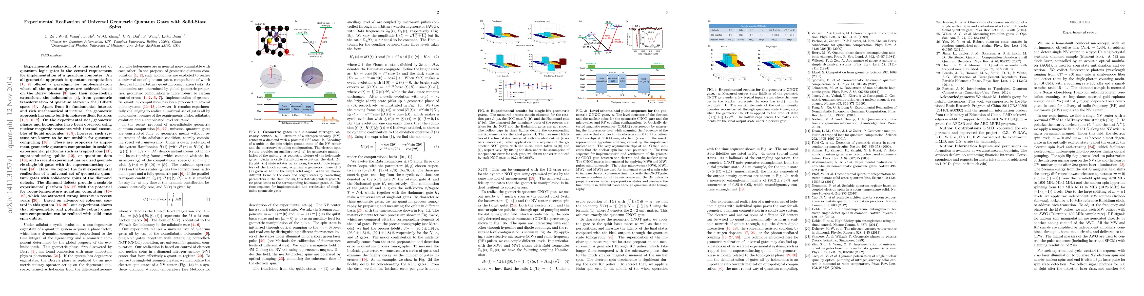 This paper reports the experimental realization of a universal set of quantum logic gates using solid-state spins in diamond defects, employing an all-geometric approach based on Berry phases and holonomies for noise-resilient quantum computation, demonstrating scalability and potential for room-temperature quantum computing.