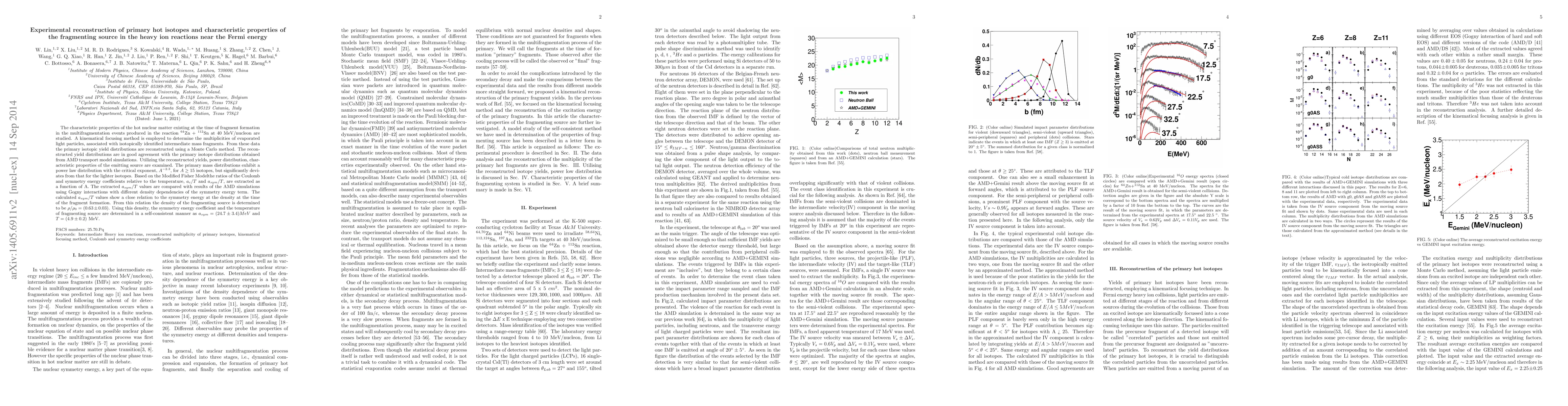 The characteristic properties of the hot nuclear matter existing at the time of fragment formation in the multifragmentation events produced in the reaction $^{64}$Zn + $^{112}$Sn at 40 MeV/nucleon are studied. A kinematical focusing method is employed to determine the multiplicities of evaporated light particles, associated with isotopically identified detected fragments. From these data the primary isotopic yield distributions are reconstructed using a Monte Carlo method. The reconstructed yield distributions are in good agreement with the primary isotope distributions obtained from AMD transport model simulations. Utilizing the reconstructed yields, power distribution, Landau free energy, characteristic properties of the emitting source are examined. The primary mass distributions exhibit a power law distribution with the critical exponent, $A^{-2.3}$, for $A \geq 15$ isotopes, but significantly deviates from that for the lighter isotopes. Landau free energy plots show no strong signature of the first order phase transition. Based on the Modified Fisher Model, the ratios of the Coulomb and symmetry energy coefficients relative to the temperature, $a_{c}/T$ and $a_{sym}/T$, are extracted as a function of A. The extracted $a_{sym}/T$ values are compared with results of the AMD simulations using Gogny interactions with different density dependencies of the symmetry energy term. The calculated $a_{sym}/T$ values show a close relation to the symmetry energy at the density at the time of the fragment formation. From this relation the density of the fragmenting source is determined to be $\rho /\rho_{0} = (0.63 \pm 0.03 )$. Using this density, the symmetry energy coefficient and the temperature of fragmenting source are determined in a self-consistent manner as $a_{sym} = (24.7 \pm 3.4) MeV$ and $T=(4.9 \pm 0.2)$ MeV.