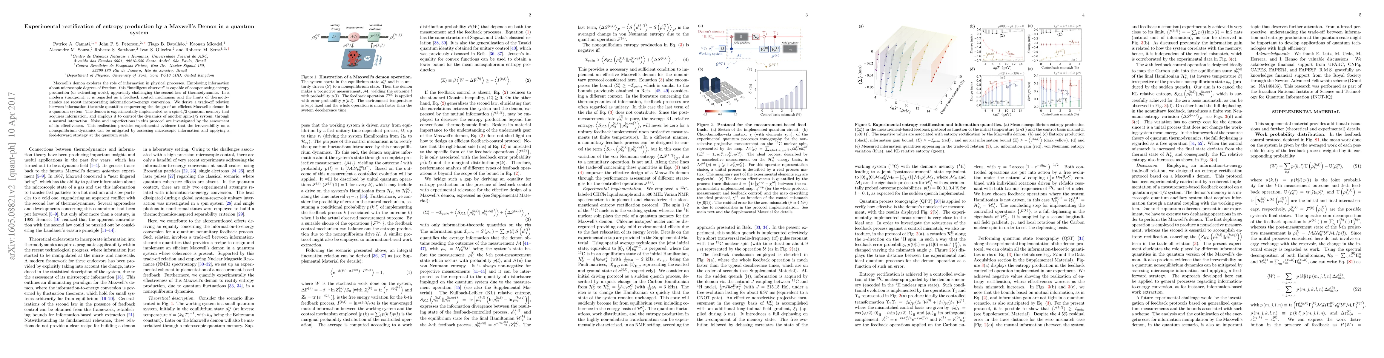 This paper experimentally demonstrates a Maxwell's demon in a quantum system, using a spin-1/2 quantum memory to acquire and utilize information to control another spin-1/2 system, thereby reducing entropy production and challenging traditional thermodynamic laws. The study investigates noise and imperfections in this feedback control mechanism, providing evidence for mitigating irreversibility through microscopic information assessment.