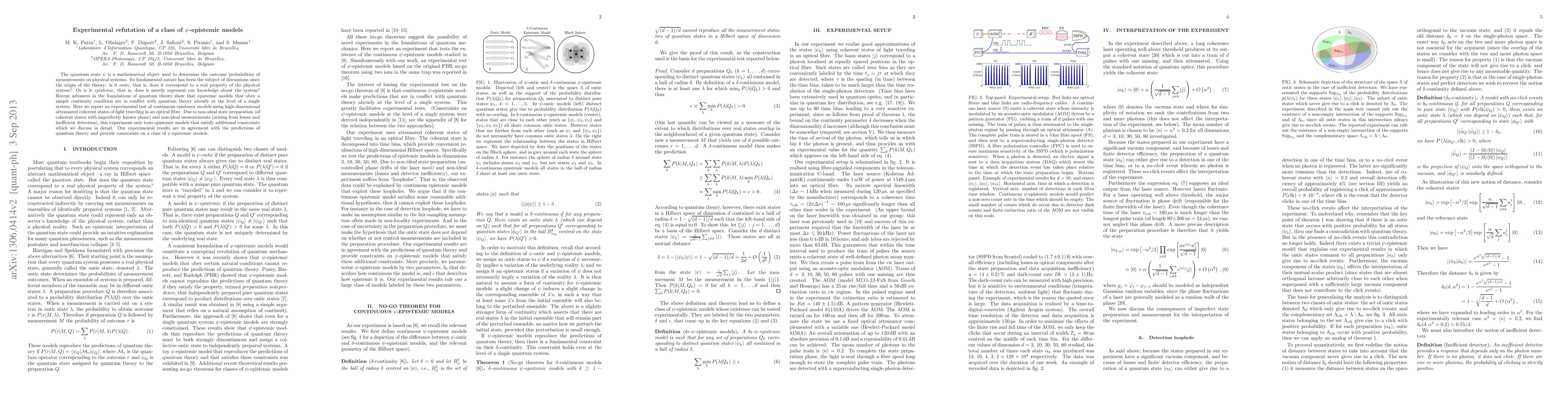 This paper reports an experimental test refuting a class of continuous epistemic models in quantum theory, using high-dimensional light states in optical fibers. The results align with quantum predictions, providing constraints on \psi-epistemic models that account for non-ideal state preparation and measurement.