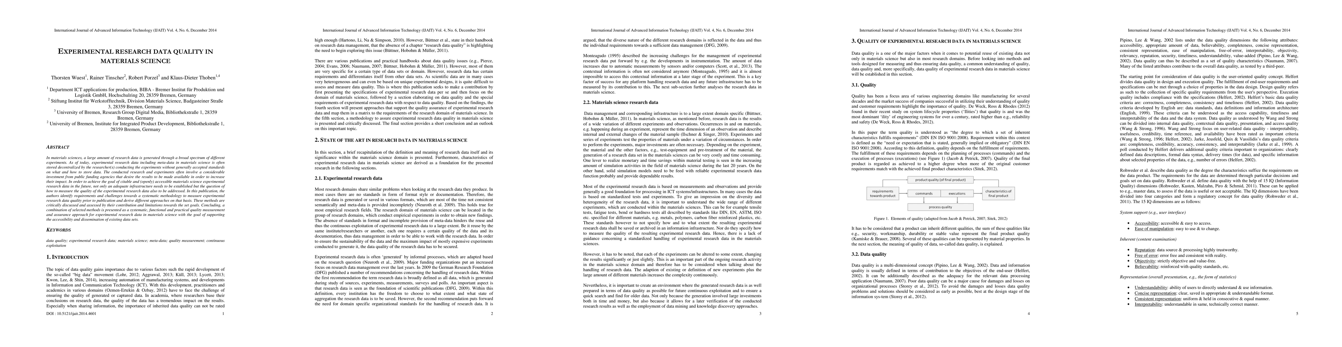 This paper discusses the decentralized storage of experimental research data in materials science and identifies the need for standardized data quality measurement methods. The authors propose a combination of selected approaches to ensure data quality, aiming to enhance the accessibility and impact of publicly funded research.