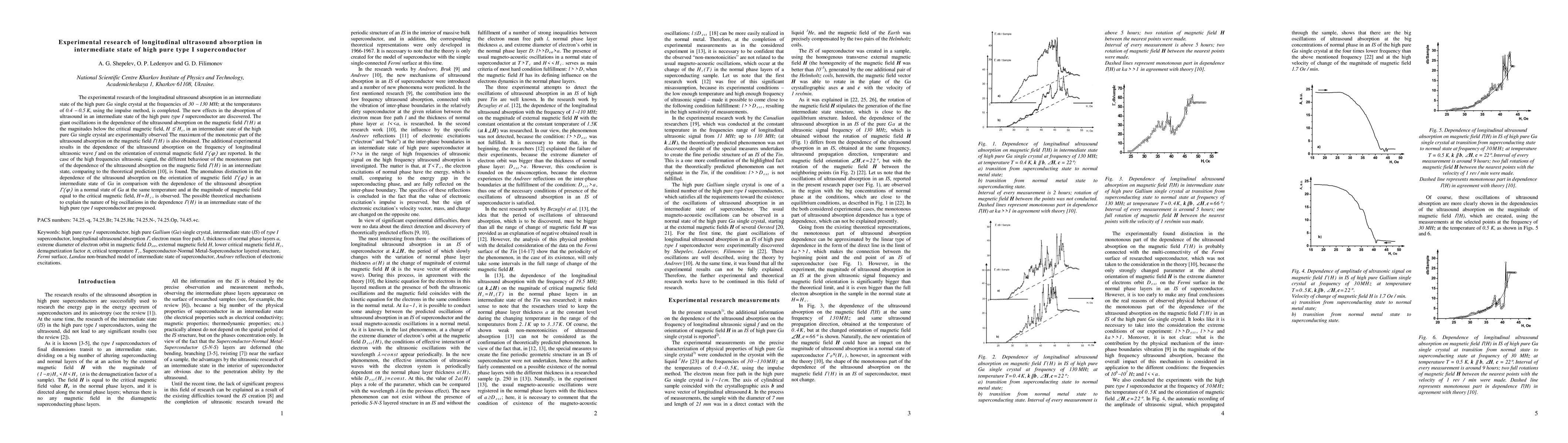 The experimental research of the longitudinal ultrasound absorption in an intermediate state of the high pure Ga single crystal at the frequencies of 30 - 130 MHz at the temperatures of 0.4 - 0.5 K, using the impulse method, is completed. The new effects in the absorption of ultrasound in an intermediate state of the high pure type I superconductor are discovered. The giant oscillations in the dependence of the ultrasound absorption on the magnetic field at the magnitudes below the critical magnetic field, H < Hc, in an intermediate state of the high pure Ga single crystal are experimentally observed The maximum of the monotonic part of the ultrasound absorption on the magnetic field is also obtained. The additional experimental results in the dependence of the ultrasound absorption on the frequency of longitudinal ultrasonic wave f and on the orientation of external magnetic field are reported. In the case of the high frequencies ultrasonic signal, the different behaviour of the monotonous part of the dependence of the ultrasound absorption on the magnetic field in an intermediate state, comparing to the theoretical prediction [10], is found. The anomalous distinction in the dependence of the ultrasound absorption on the orientation of magnetic field in an intermediate state of Ga in comparison with the dependence of the ultrasound absorption in a normal state of Ga at the same temperature and at the magnitude of magnetic field equal to the critical magnetic field, H = Hc, is observed. The possible theoretical mechanisms to explain the nature of big oscillations in the dependence in an intermediate state of the high pure type I superconductor are proposed.