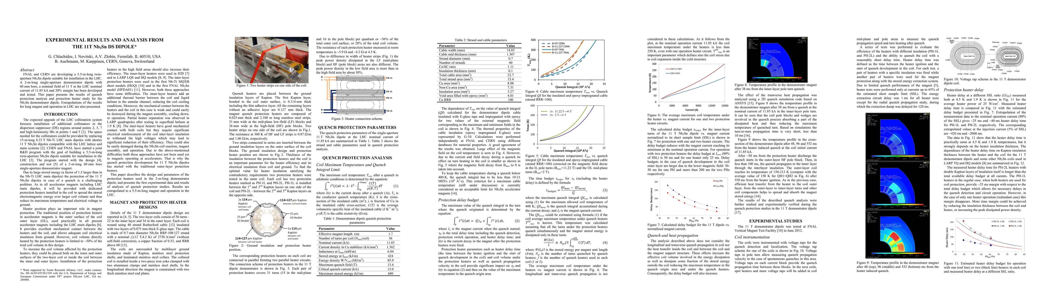 FNAL and CERN are developing a 5.5-m-long twin-aperture Nb3Sn dipole suitable for installation in the LHC. A 2-m-long single-aperture demonstrator dipole with 60 mm bore, a nominal field of 11 T at the LHC nominal current of 11.85 kA and 20% margin has been developed and tested. This paper presents the results of quench protection analysis and protection heater study for the Nb3Sn demonstrator dipole. Extrapolations of the results for long magnet and operation in LHC are also presented.