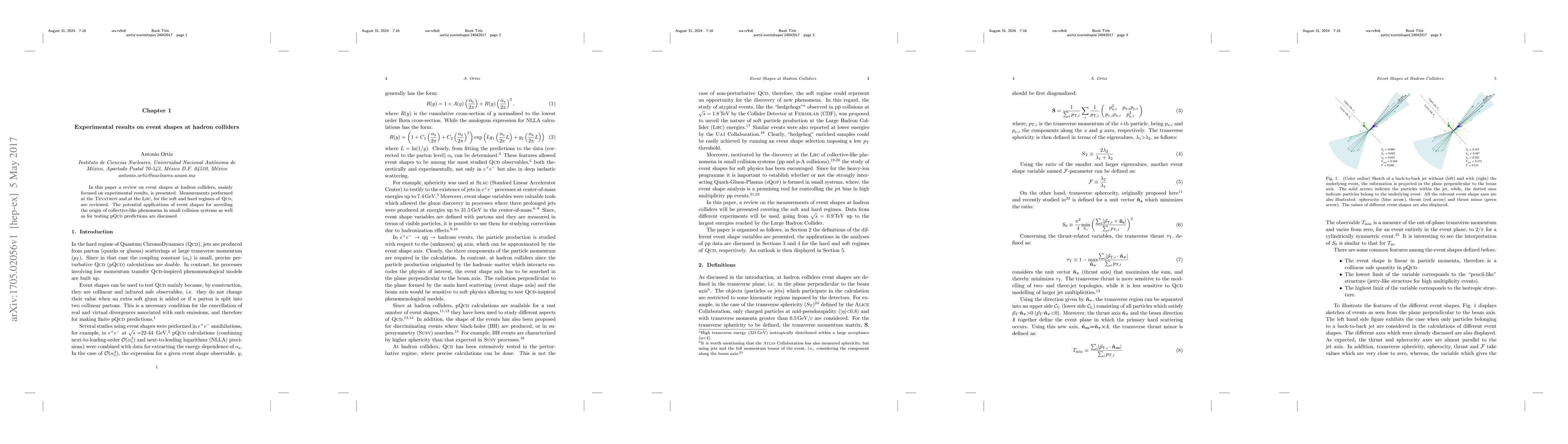 This paper reviews experimental results on event shapes at hadron colliders, focusing on measurements from the Tevatron and LHC. It discusses the potential of event shapes to reveal collective phenomena in small collision systems and to test predictions of perturbative QCD.