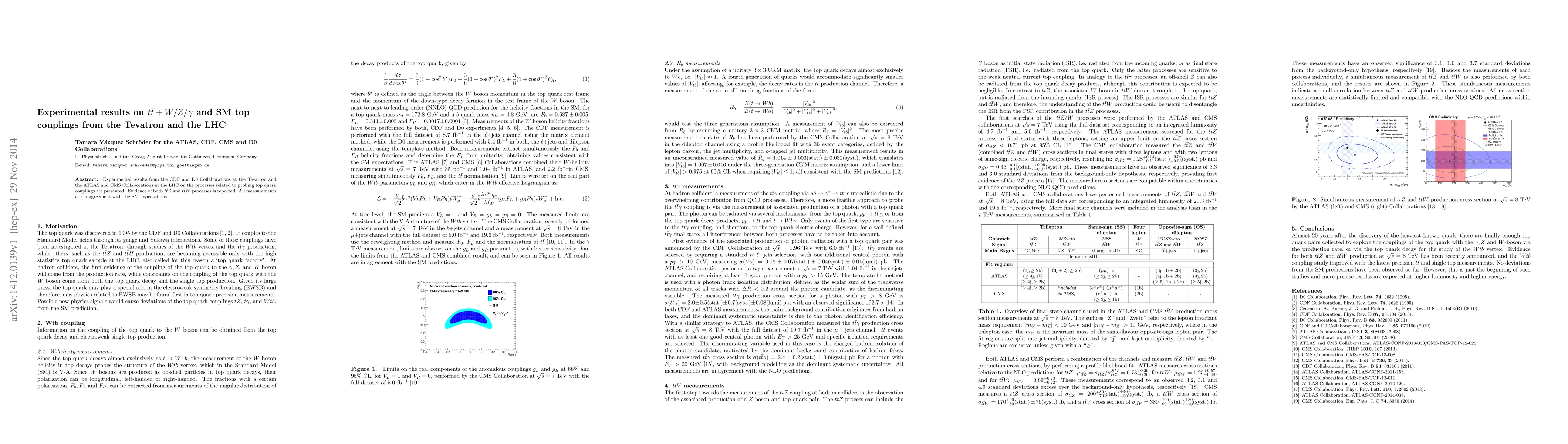 Summary: This paper presents experimental results from the Tevatron and LHC collaborations on top quark couplings, showing evidence of $t\bar{t}Z$ and $t\bar{t}W$ processes, with all measurements consistent with Standard Model predictions.