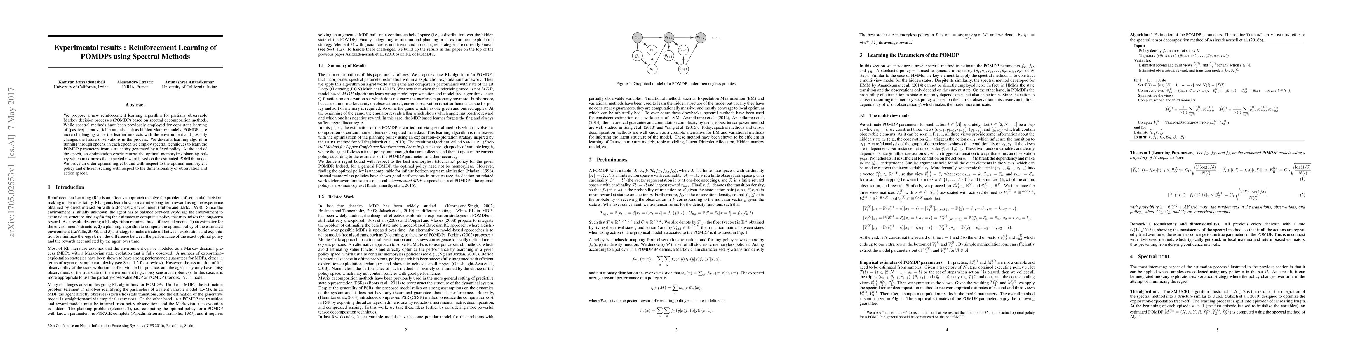 This paper presents a novel reinforcement learning algorithm for Partially Observable Markov Decision Processes (POMDPs) using spectral methods. The algorithm learns POMDP parameters from trajectories generated by fixed policies, employing spectral techniques in each epoch. An optimization oracle then provides the optimal memoryless planning policy, with proven order-optimal regret bounds and efficient dimensionality scaling.