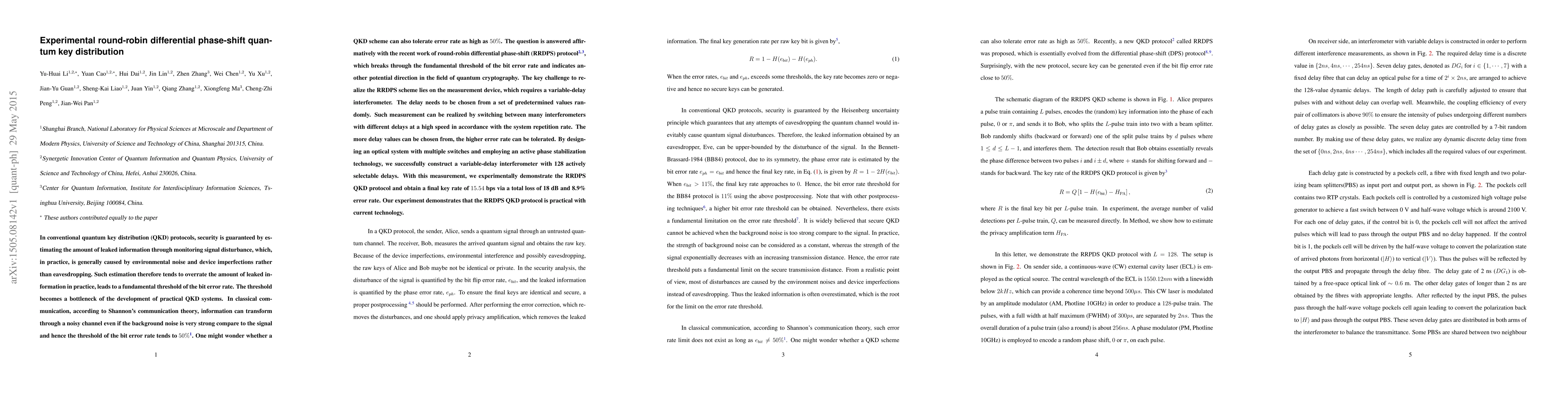 This paper presents an experimental round-robin differential phase-shift (RRDPS) quantum key distribution (QKD) protocol that breaks through the conventional bit error rate threshold, enabling higher error rates and thus improving practical QKD systems. The authors construct a variable-delay interferometer with 128 selectable delays, achieving a final key rate of 15.54 bps with an 8.9% error rate.