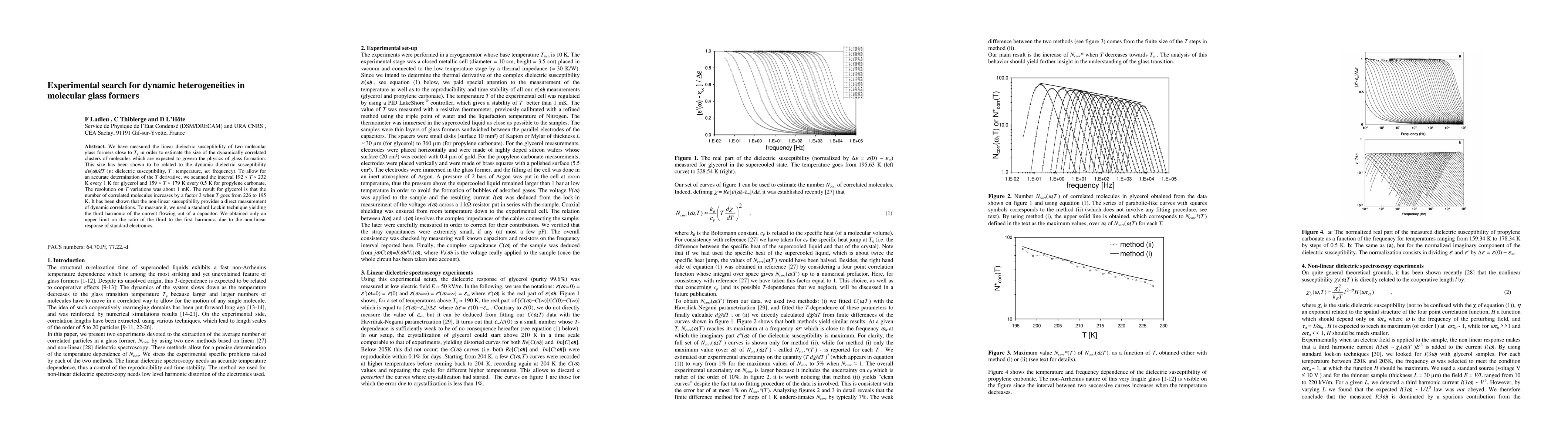 We have measured the linear dielectric susceptibility of two molecular glass formers close to Tg in order to estimate the size of the dynamically correlated clusters of molecules which are expected to govern the physics of glass formation. This size has been shown to be related to the dynamic dielectric susceptibility dEps(w)/dT (Eps : dielectric susceptibility, T : temperature, w: frequency). To allow for an accurate determination of the T derivative, we scanned the interval 192 < T < 232 K every 1 K for glycerol and 159 < T < 179 K every 0.5 K for propylene carbonate. The resolution on T variations was about 1 mK. The result for glycerol is that the number of correlated molecules increases by a factor 3 when T goes from 226 to 195 K. It has been shown that the non-linear susceptibility provides a direct measurement of dynamic correlations. To measure it, we used a standard Lockin technique yielding the third harmonic of the current flowing out of a capacitor. We obtained only an upper limit on the ratio of the third to the first harmonic, due to the non-linear response of standard electronics.